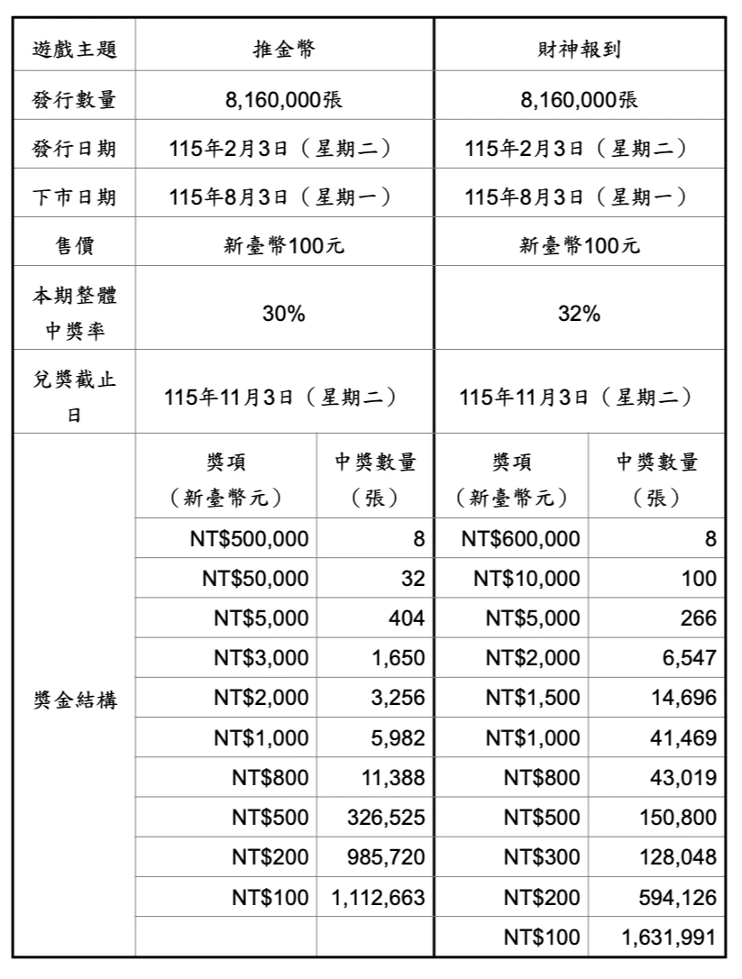 另外,今日也同步上市4款新品刮刮樂,包含售價200元的益智延長型遊戲「獎金樂翻倍」,有機會刮出1、2、3、5、10倍,最高20倍的獎金,頭獎200萬元共有8個,總中獎率31%;售價200元的「好運連發」,1000元(含)以上的獎項超過28萬個,頭獎200萬元共有7個,總中獎率36%;售價100元的「推金幣」頭獎50萬元共有8個,總中獎率30%;售價100元的「財神報到」頭獎60萬元共有8個,總中獎率32%。