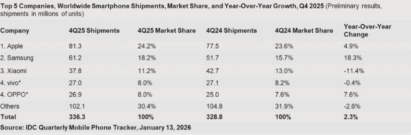 【財經中心╱台北報導】IDC 今日發布「全球季度手機追蹤報告」初步數據顯示,2025年第4季全球智慧手機出貨量年增2.3%,達到3.363 億支,儘管受到記憶體晶片短缺影響,市場仍在高階機型持續成長、折疊螢幕強勁表現及消費者對未來漲價預期而提前換機推動下,出貨量持續成長。