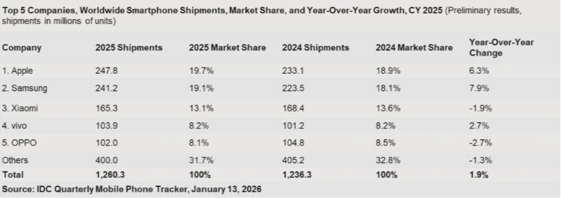 2025 全年,全球智慧手機出貨量達12.6億支,較去年同期成長1.9%。報告稱,蘋果與三星成為前5大廠商中成長最強勁的2家,較去年同期成長率分別達到6.3% 與7.9%,蘋果連續第3年穩居全球第1,靠著iPhone 17系列在中國市場的亮麗表現,創造歷史新高的出貨量。