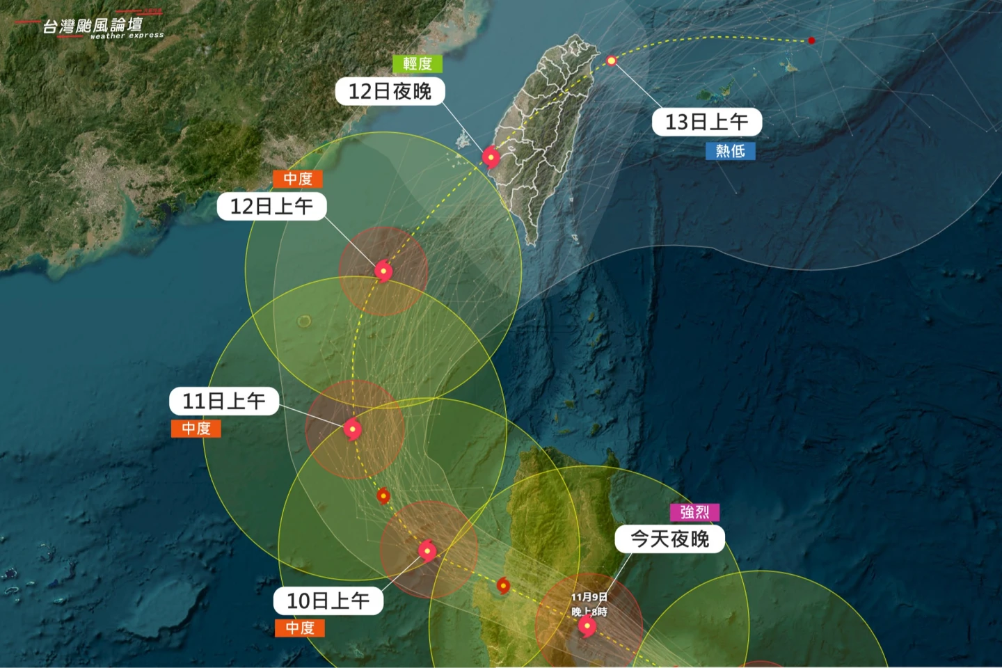 在風雨方面,「台灣颱風論壇」提醒,雖然颱風靠近台灣時會逐步減弱為輕度颱風,但其體型龐大,以下區域將有顯著影響: