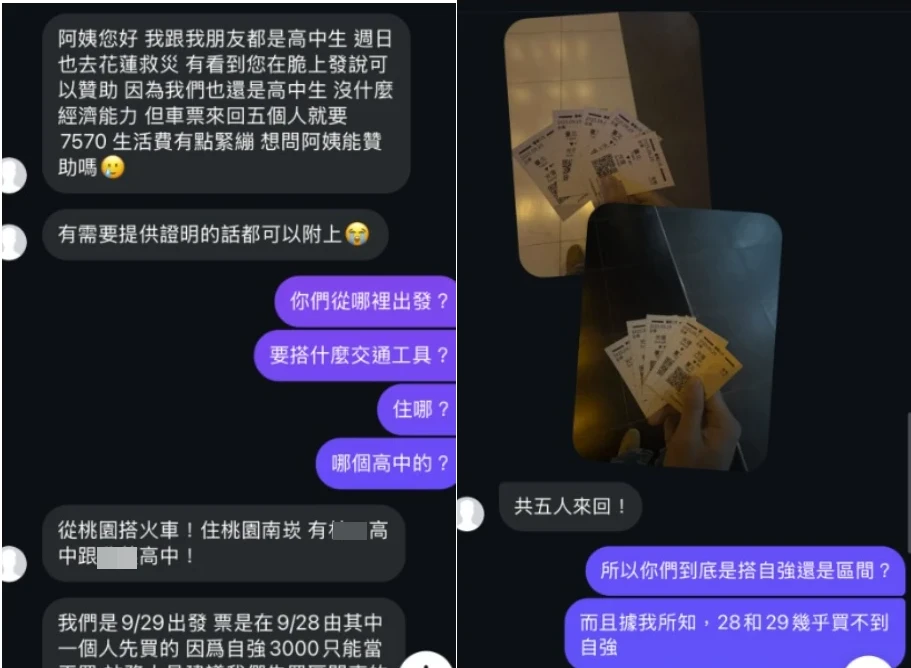 女網友原本持懷疑態度,詢問細節後,對方宣稱,他們一行有5人都是高中生,分別就讀2校,並透露會在9月29日搭火車出發前往花蓮,其中同行一人已在28日先買車票,尾末還附上5張車票及花蓮災區照片,以及花蓮鏟子超人補給站的照片當佐證,女網友信以為真而匯款,並鼓勵高中生「做好事會有好報的」。