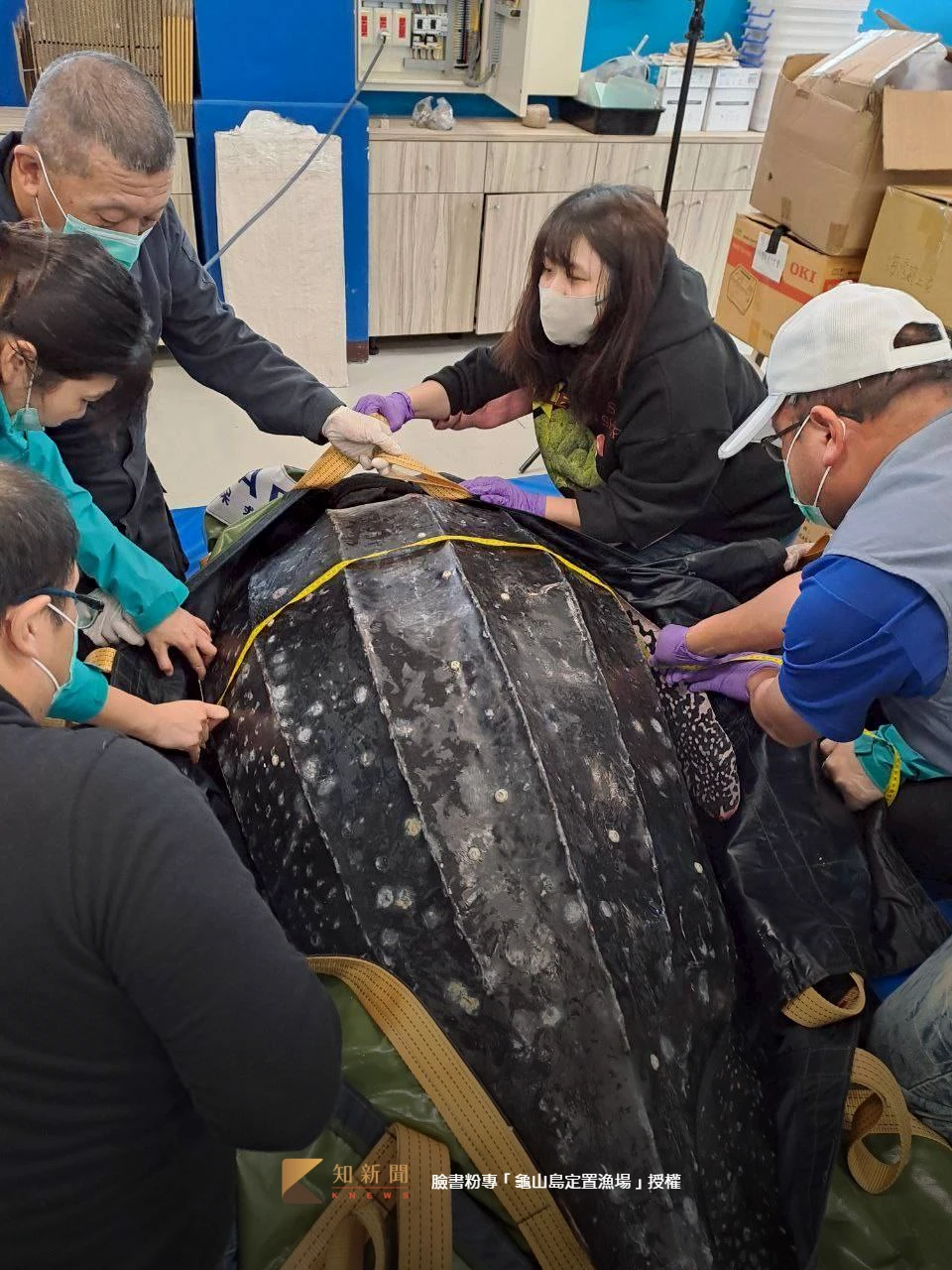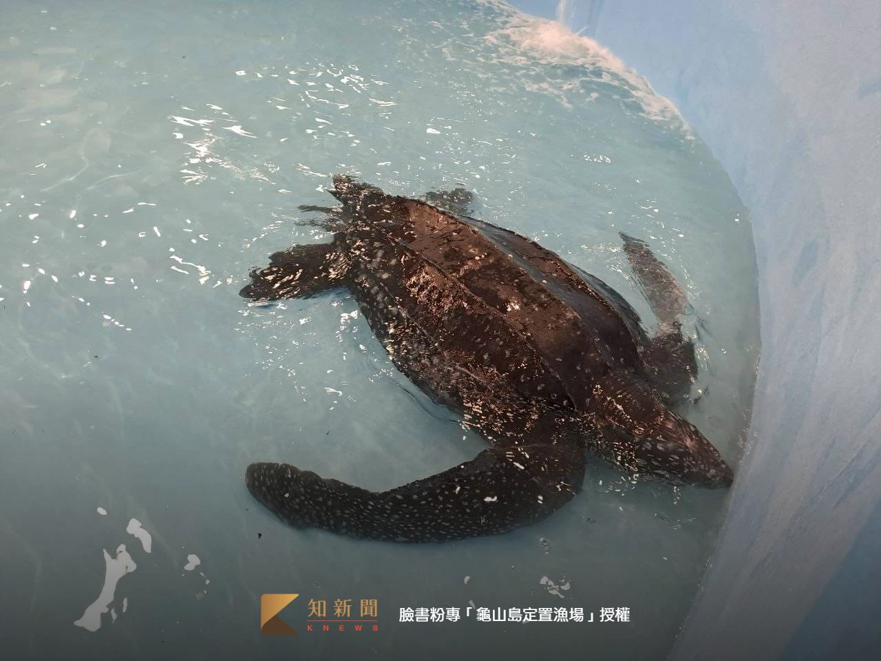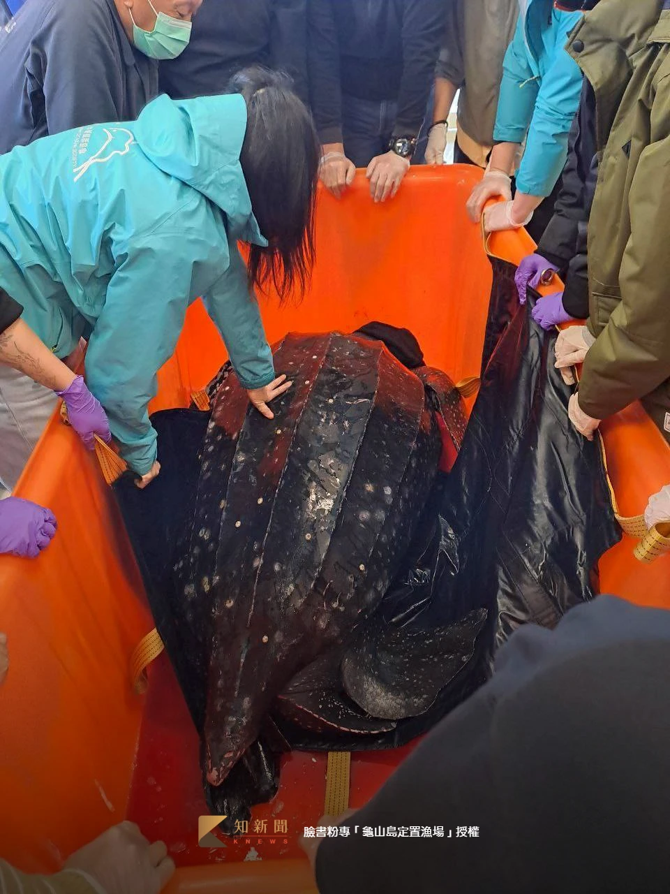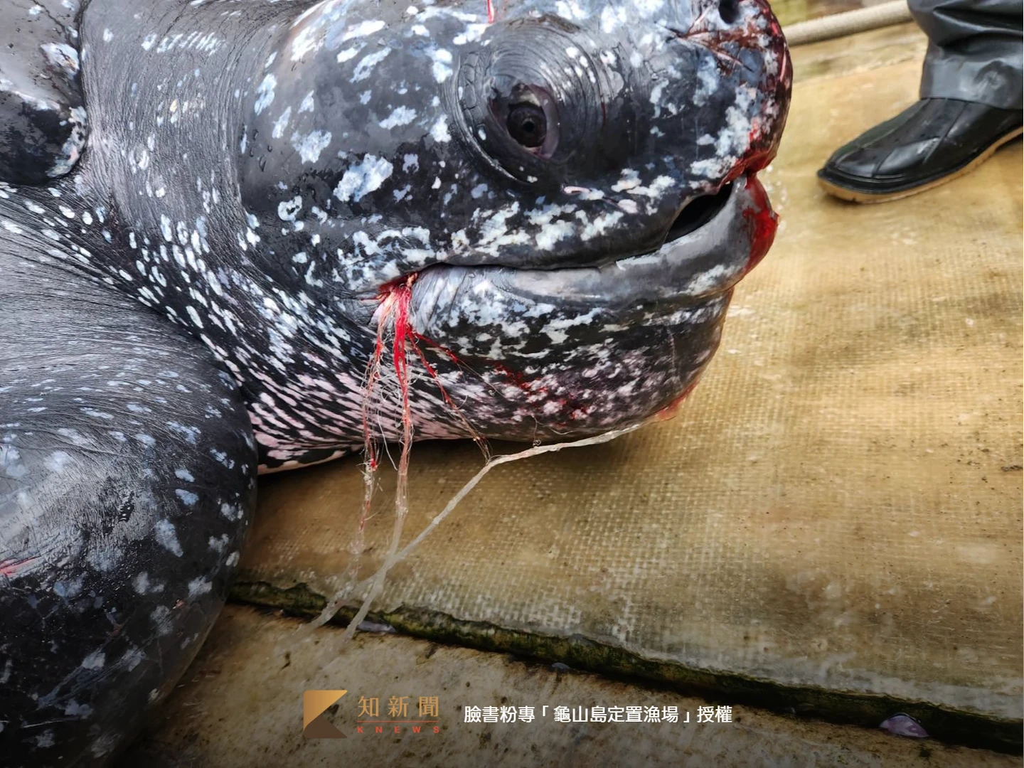 臉書粉專「龜山島定置漁場」昨發文求救,一隻革龜誤闖定置漁場,漁民雖然已清除身上纏繞的漁網,但嘴裡還有漁網,要請專業人員協助!希望龜爺爺能平安原放!