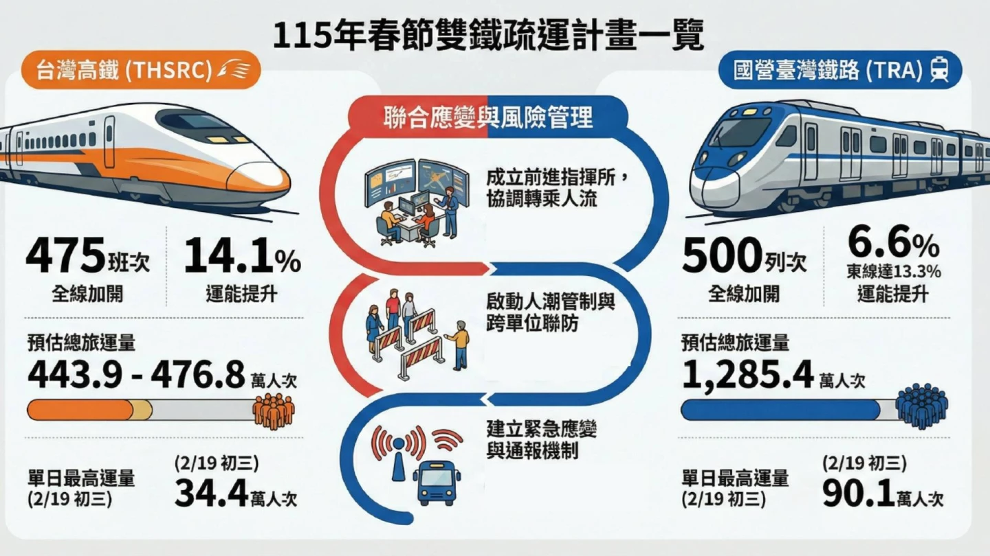 【記者陳怡文/台北報導】今(2026)年春節及和平紀念日連假分別自2月14日(六)起至2月22日(日)止及自2月27日(五)起至3月1日(日)止,分別為9天與3天連假,由於本次2個連假相鄰,交通部已請各疏運單位將2個連假結合成一長連假,進行整體疏運規劃,為減輕連假期間道路壅塞情況,高鐵透過增開475班次,臺鐵全線加開500班次,國道客運日均開行約6,500至7,000班,另外,國內空運提供4,800架次、36.4萬座位,而本島離島8條海運航線則規劃開行1,812航次、38.9萬座位,桃園機場預估每日將有13.7萬至16.4萬人次入出境。