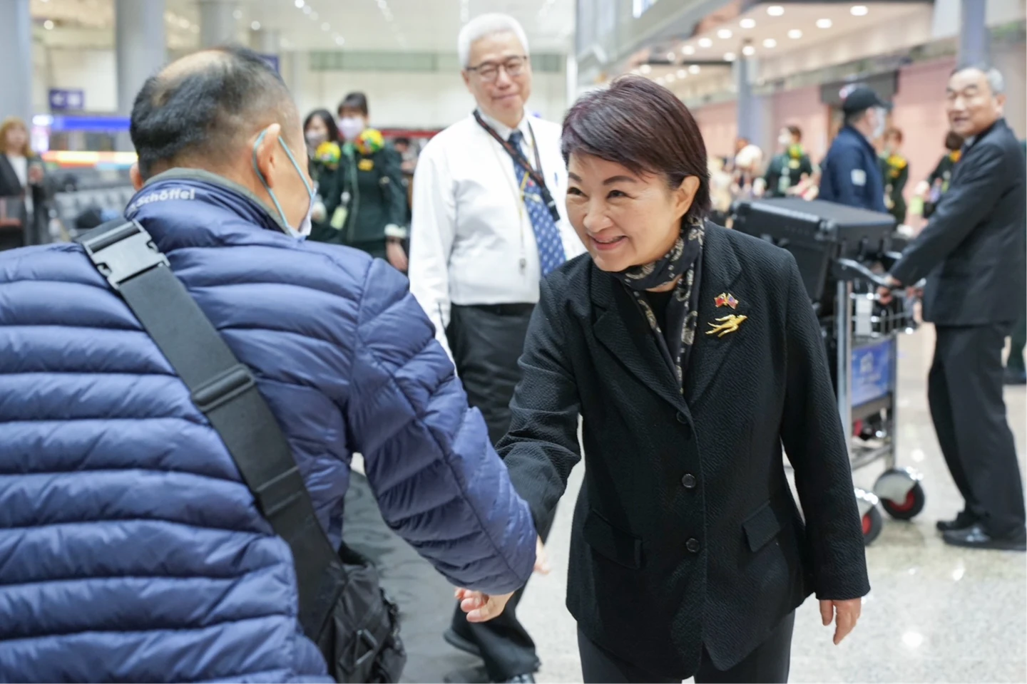 盧秀燕返國在機場與熱情民眾握手寒暄。台中市府提供 zoomin