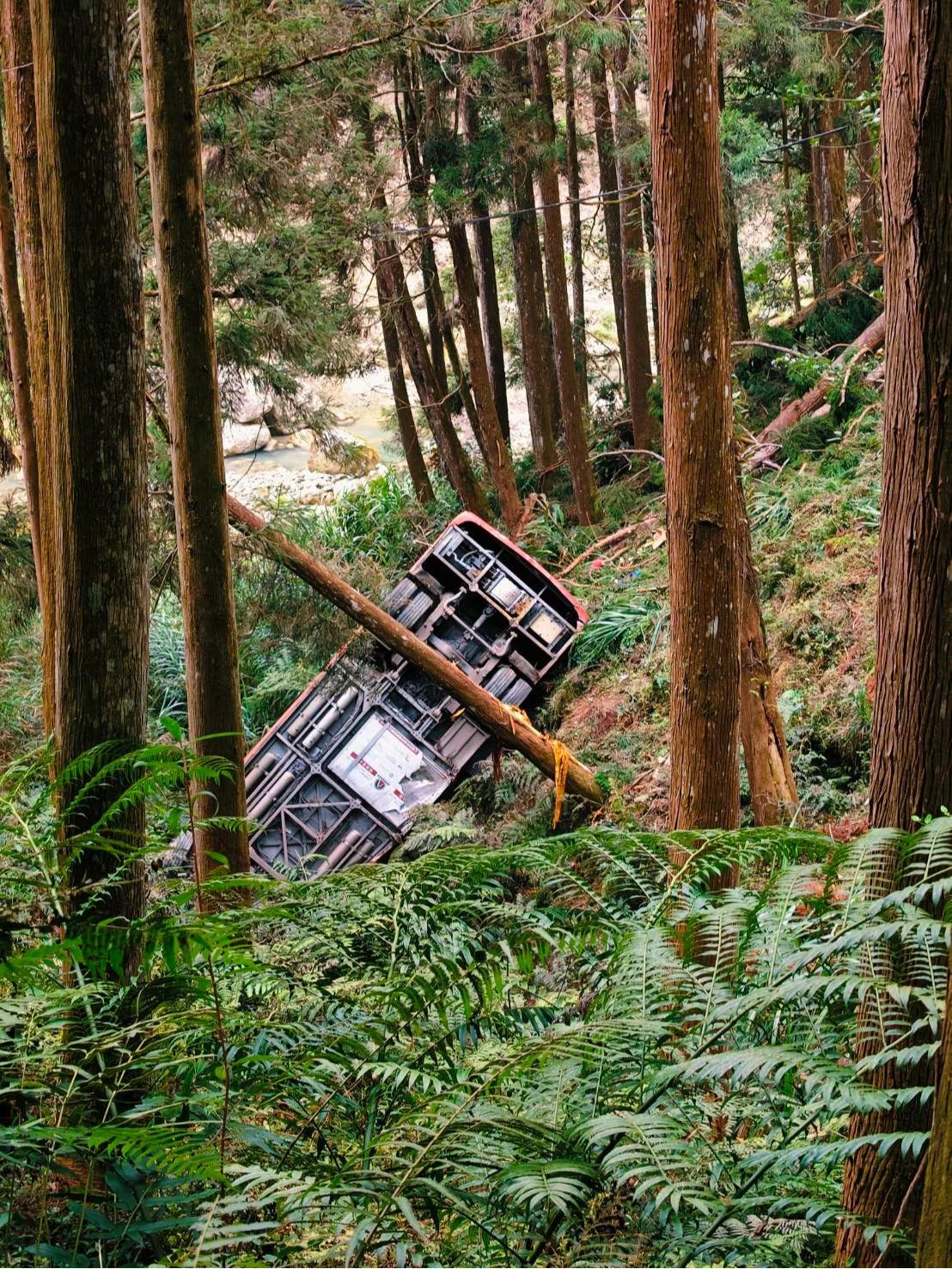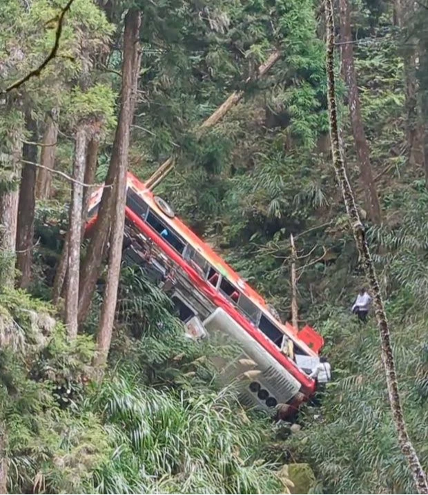 南投縣竹山鎮杉林溪森林遊樂區驚傳接駁車墜谷,有民眾突然聽到「蹦一聲」,接著看到遠方的樹倒了,接著發現巴士在谷中。