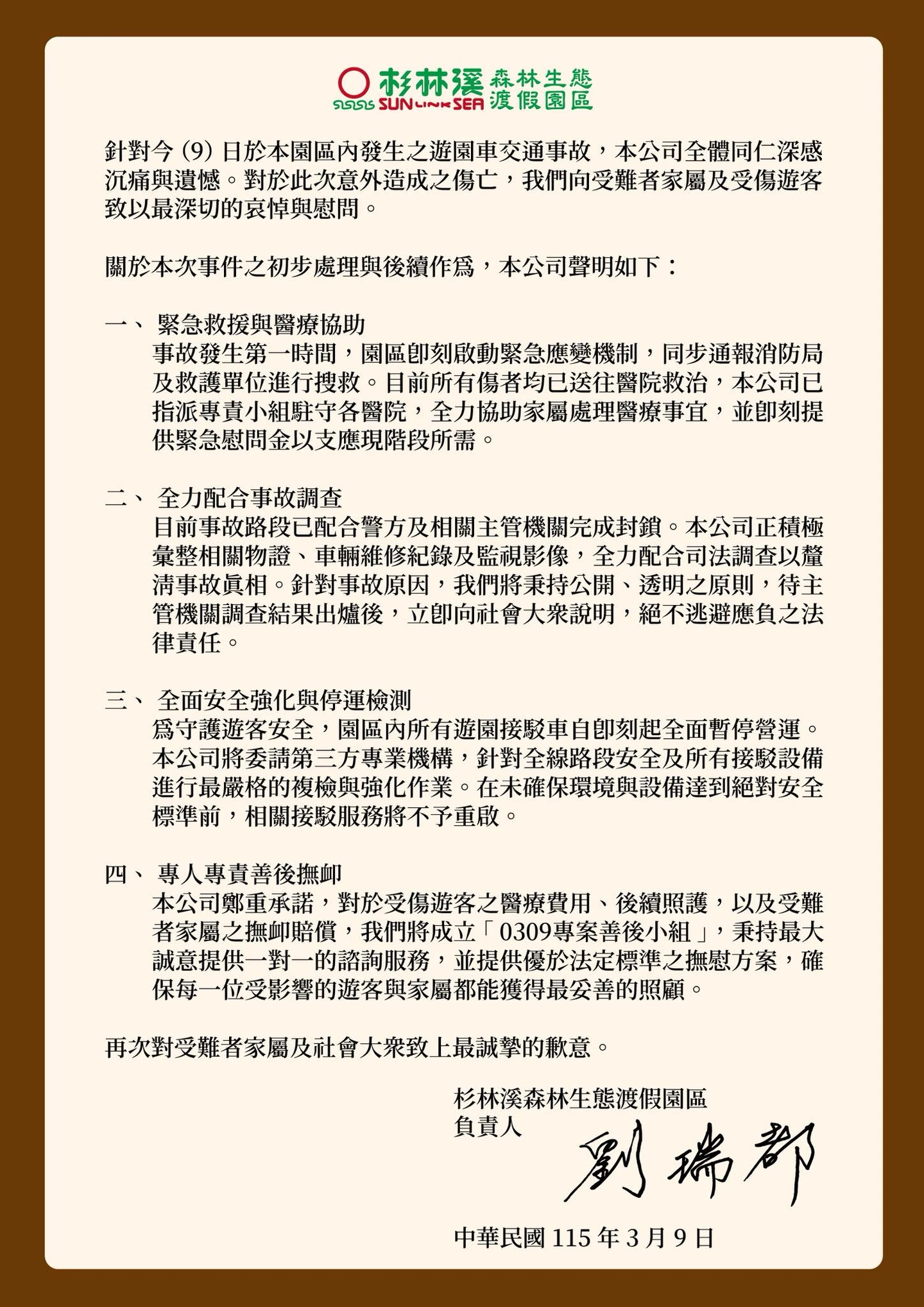 園方最新發出4聲明,向受難者家屬及受傷遊客致以最深切的哀悼與慰問,宣布園區內所有遊園車都暫停營運。針對事故原因,將秉持公開、透明之原則,待主管機關調查結果出爐後,立即向社會大眾說明,絕不逃避應負之法律責任。