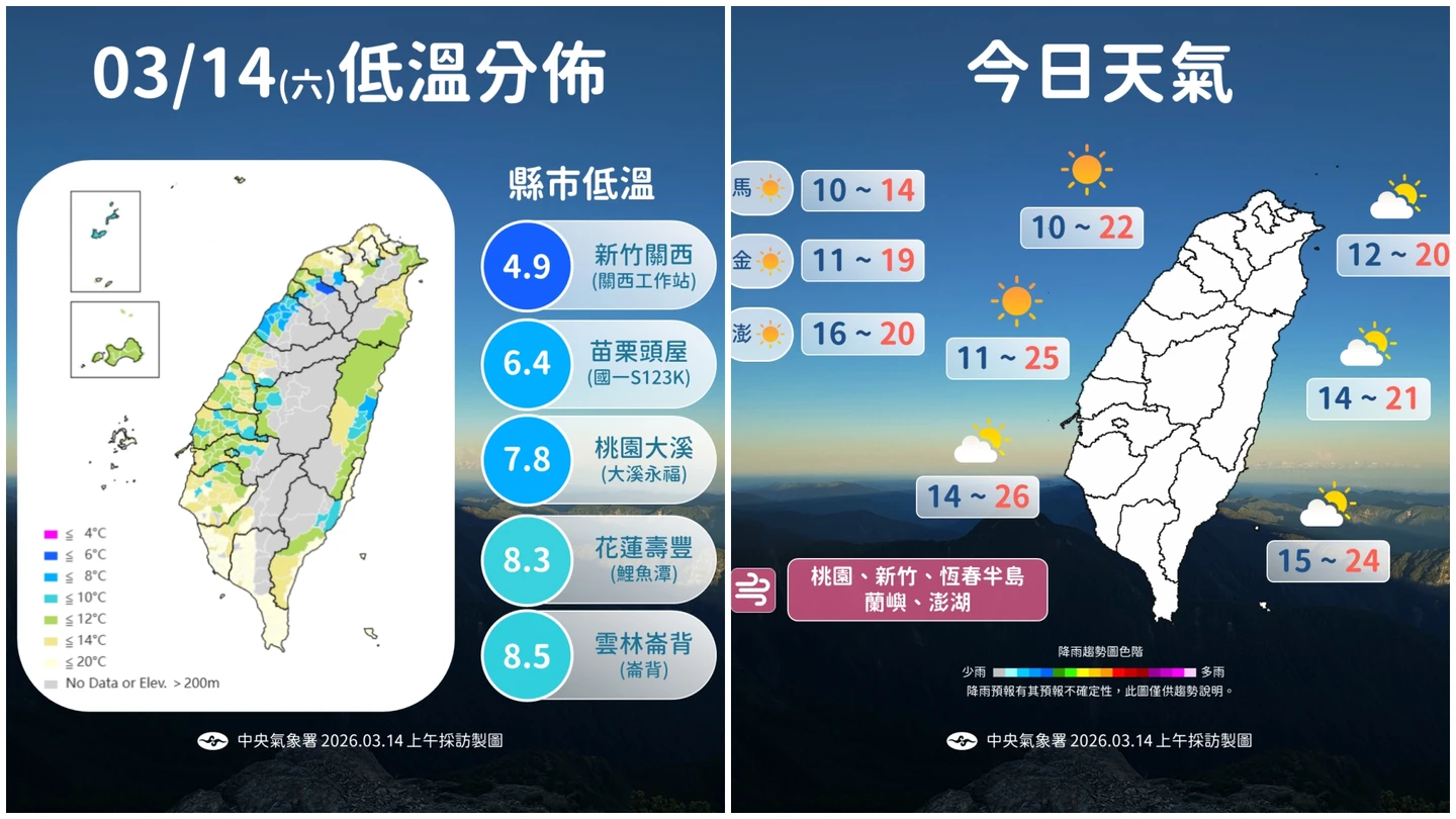 中央氣象署於今日上午針對多個縣市發布低溫特報,指出受到大陸冷氣團及輻射冷卻雙重影響,新竹縣局部地區有機會出現6度以下的氣溫,亮起橙色燈號。此外,新北市、桃園市及苗栗縣等14個縣市亦須留意攝氏10度左右的低溫(黃色燈號)。根據氣象署實際觀測資料顯示,今日清晨本島平地最低溫出現在新竹關西,氣溫僅有4.9度,而苗栗縣頭屋鄉與新竹縣寶山鄉也分別測得6.4度及6.8度的低溫。