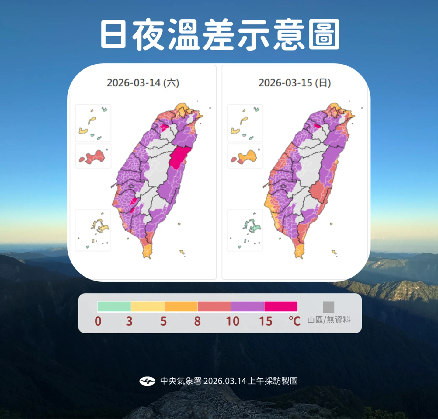 隨著冷空氣減弱,白天北部氣溫舒適、中南部感受微熱,今日各地預測氣溫約落在:北部9至25度、中部9至28度、南部10至30度及東部9至27度。不過吳德榮特別提醒,今晚至明晨因輻射冷卻作用發威,局部平地仍有探底10度左右低溫的機會,日夜溫差大,民眾早晚務必注意保暖。