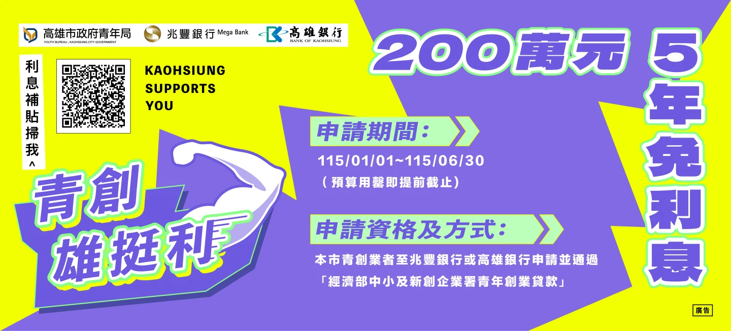除利息補貼外,青年局亦持續推動參展補助、提供不同規模事業體申請的「一般型」與「競爭型」創業補助,以及涵蓋行銷、法務與財務等主題的免費培訓課程,構築完善的青創支持體系。有資金需求或創業疑問的青年朋友,歡迎搜尋「高雄市政府青年局」官網,或追蹤 FB、IG 與 LINE@(@youth.kcg),即時掌握最新青創資源資訊。
