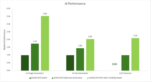 在生成式AI的業界標準基準測試中,RTX PRO 5000 72GB的影像生成效能相較上一代 NVIDIA硬體提升達3.5倍,文字生成效能則可提升達2倍。