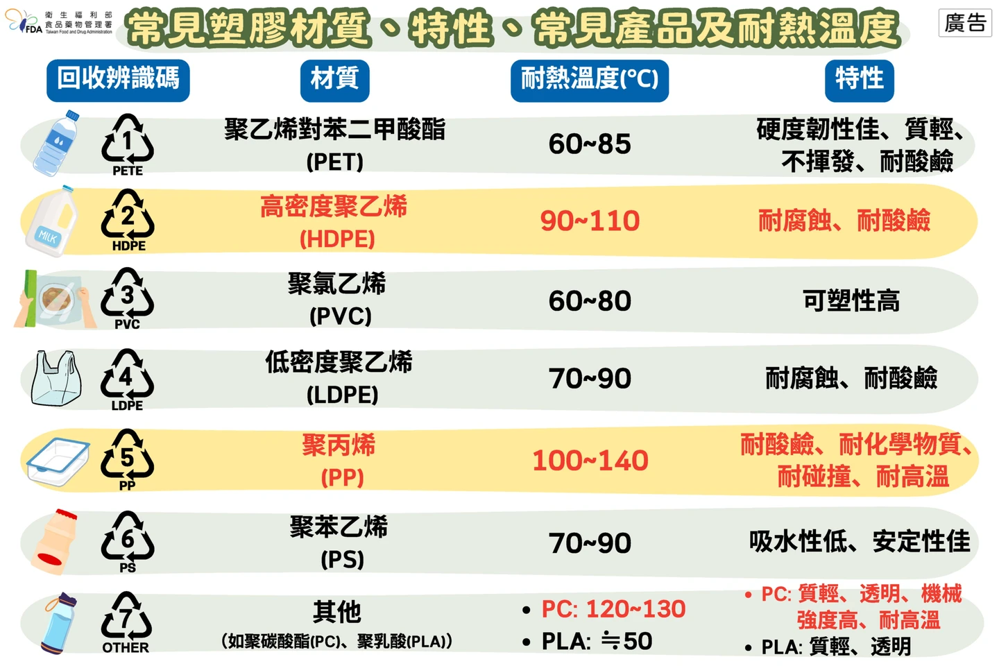 常見塑膠材質耐熱溫度。食藥署提供 zoomin