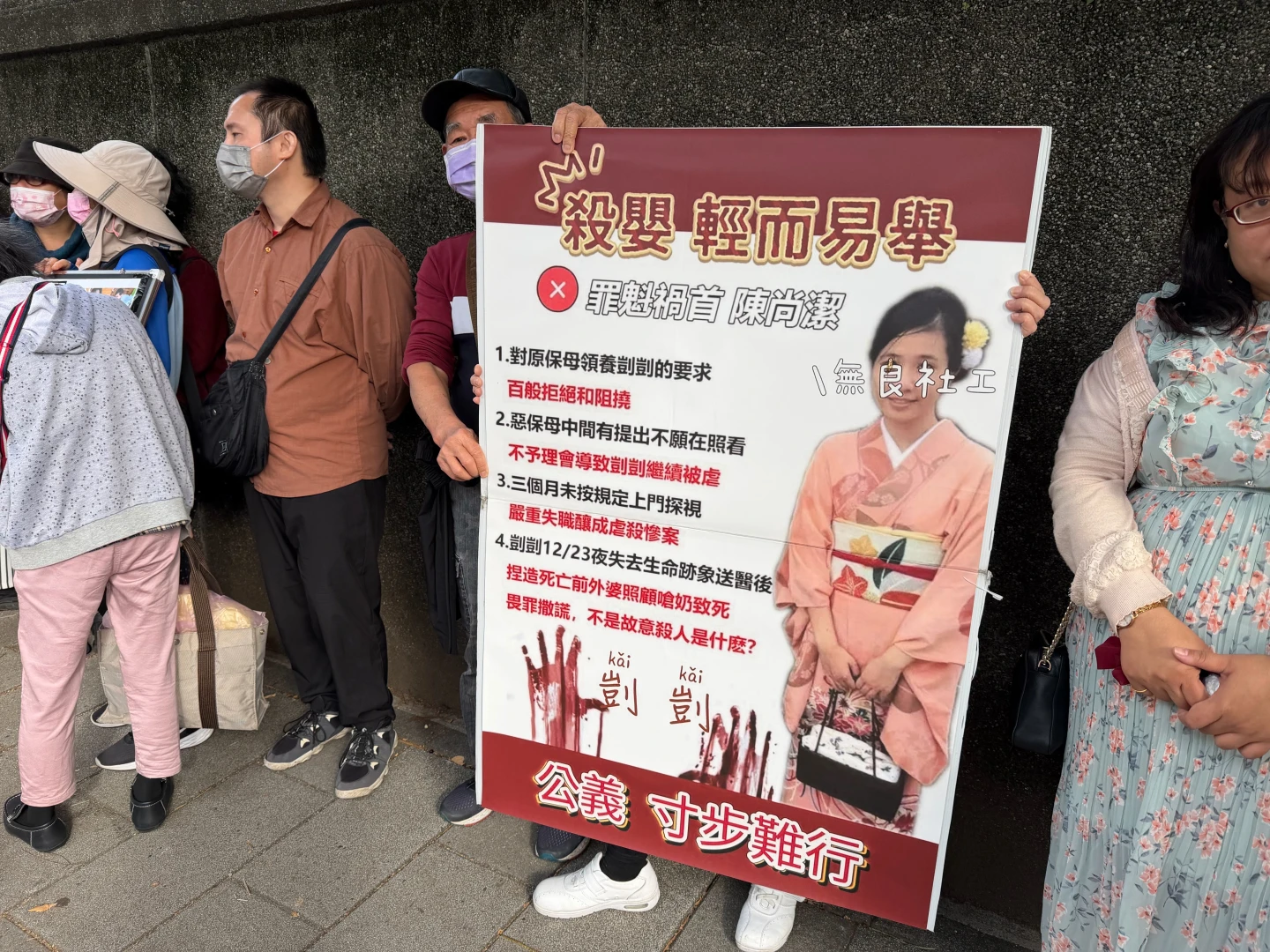 剴剴慘遭虐死引發民眾憤慨,陳尚潔日前出庭時,多名「剴剴戰士」到法院外抗議,怒吼「嚴懲兇手」、「重判」。