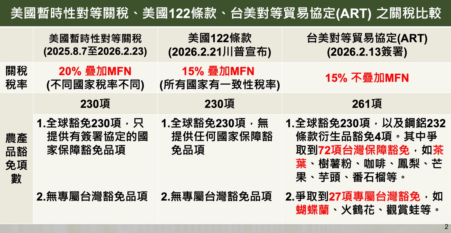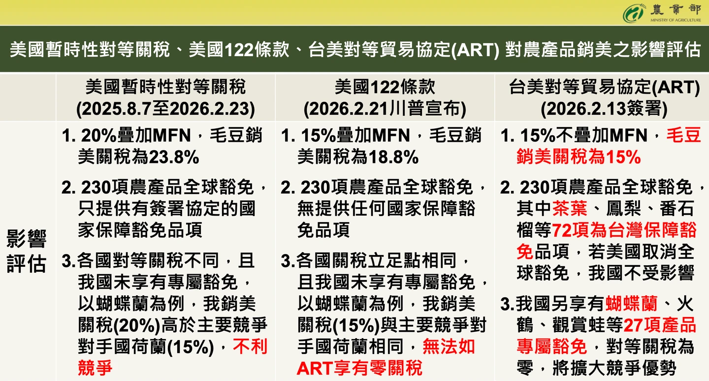 陳駿季表示,台美對等貿易協定(ART)下,我國農產品銷美享15%不疊加MFN稅率,並有261項農產品豁免對等關稅,包括27項專屬豁免及72項保障豁免,相較於美國暫時性對等關稅或美國122條款,ART有利於提升我農產品在美國市場之競爭條件。