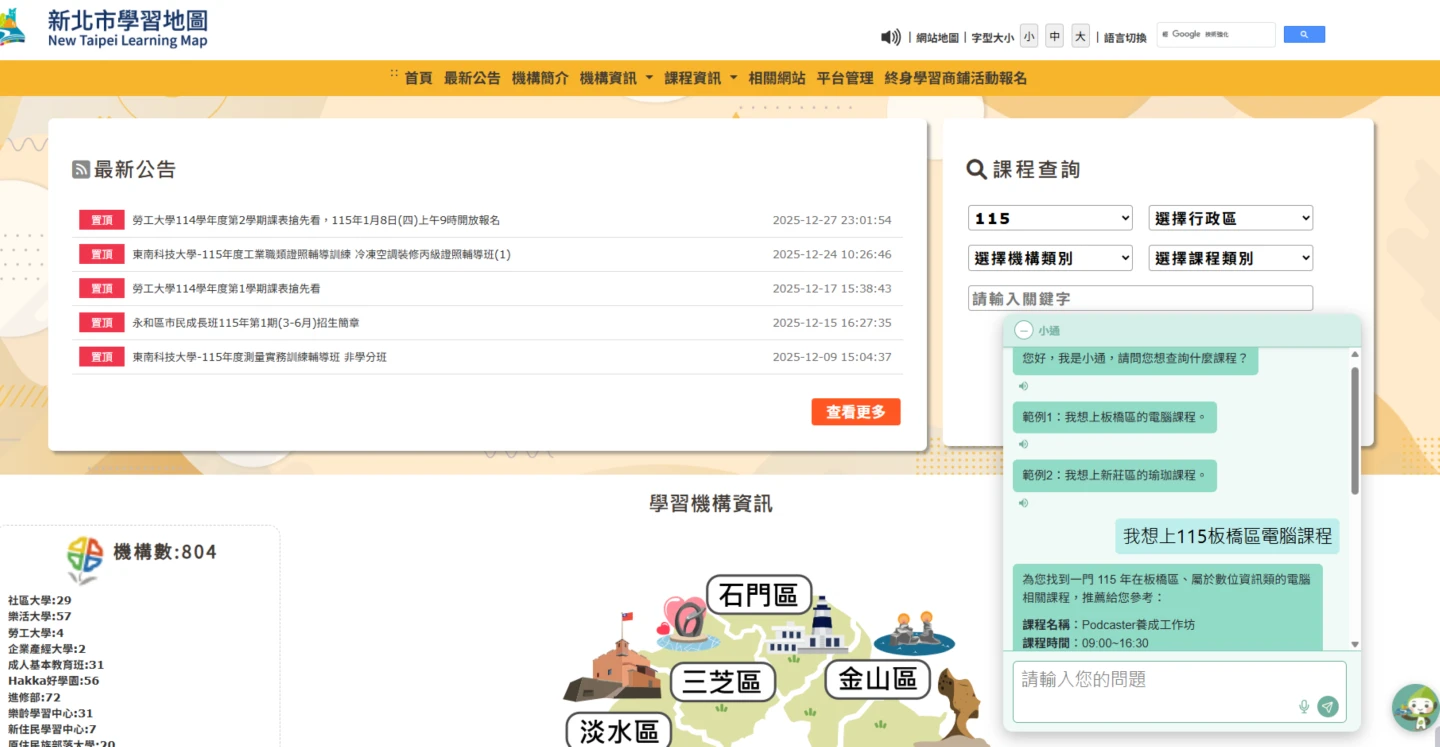 1 新北學習地圖網導入AI語音客服,讓長者及不熟悉操作者能口語查詢萬堂課程。