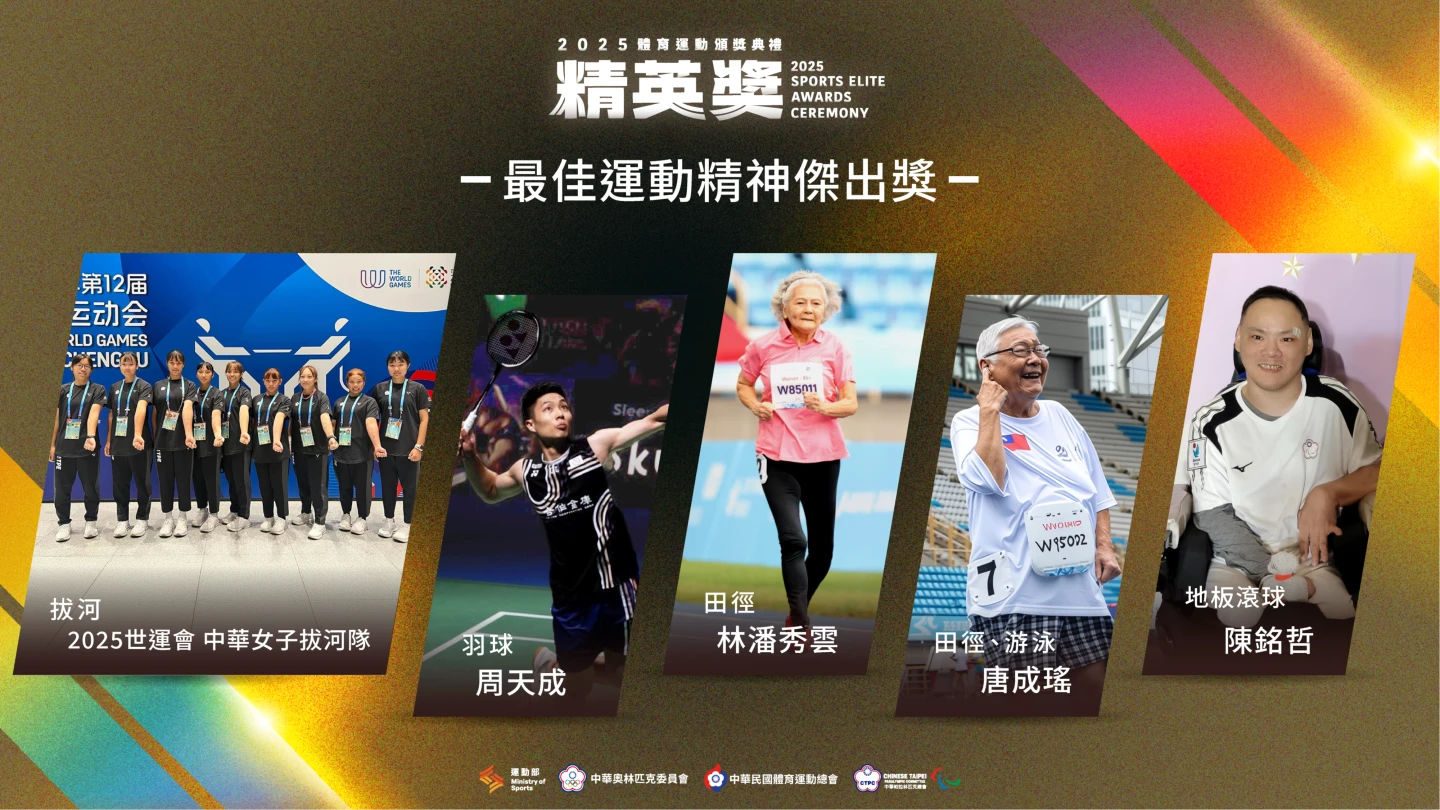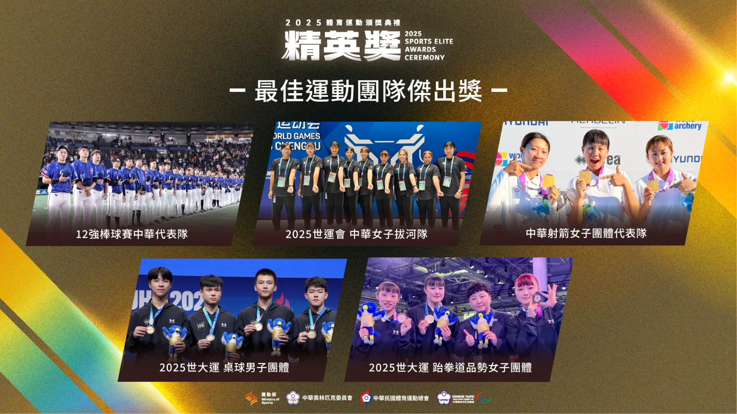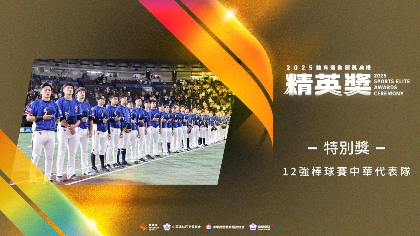 今年精英獎各獎項的評選事蹟期間是113年10月1日起至114年9月30日止,由各機關推薦及媒體推薦,去年11月中華棒球隊在世界棒球12強賽創造歷史,奪下台灣棒球首座世界冠軍,讓全民瞬間掀起棒球狂潮。如今更直接獲得本年度精英獎「特別獎」。