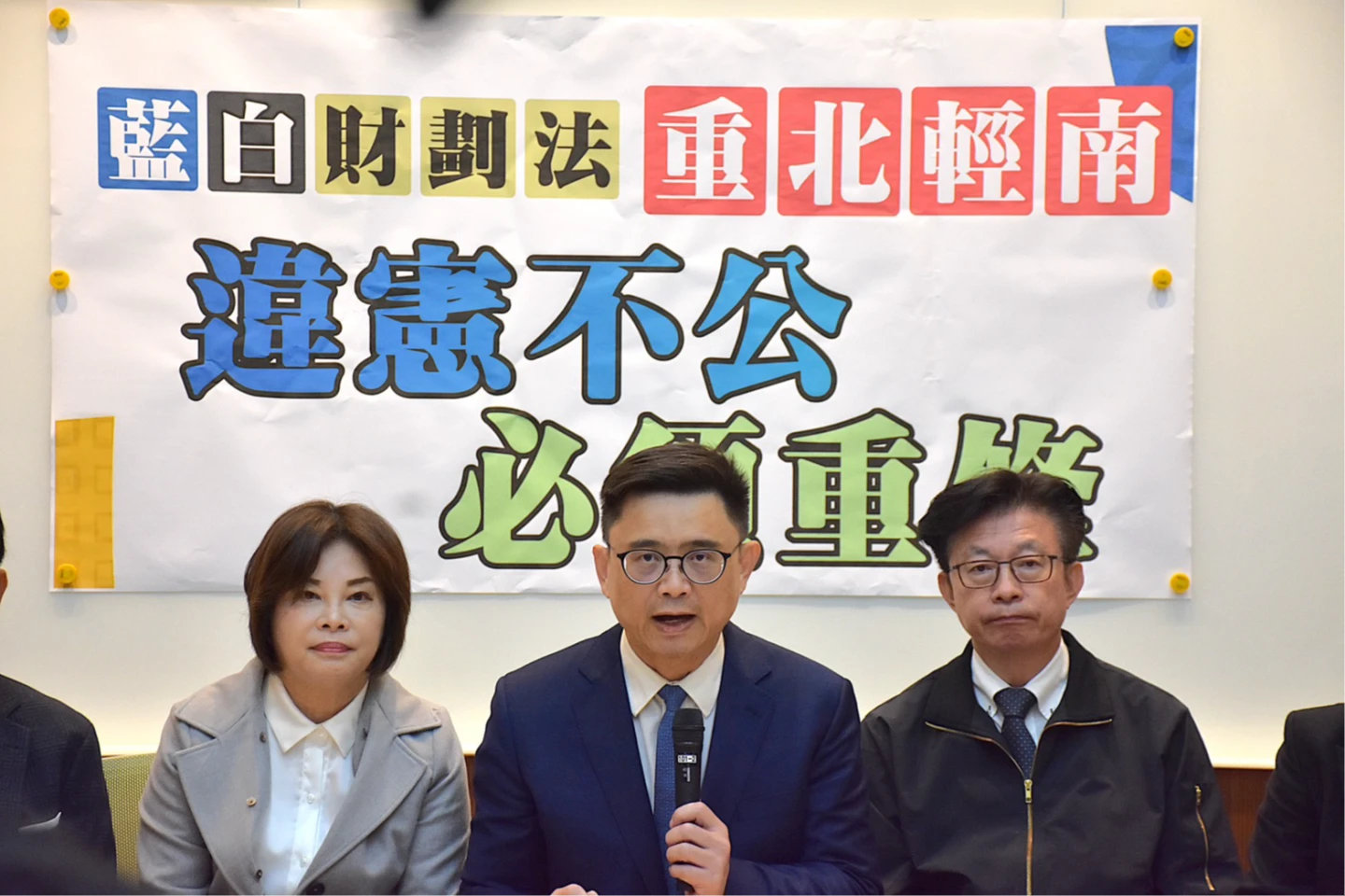 民進黨台南林俊憲、陳亭妃、郭國文、賴惠員、高雄李昆澤、林岱樺、邱議瑩、許智傑、賴瑞隆,及屏東徐富癸、鍾佳濱等10名立委,今早召開聯合記者會,高呼「藍白財劃法重北輕南,違憲不公,必須重修」口號。