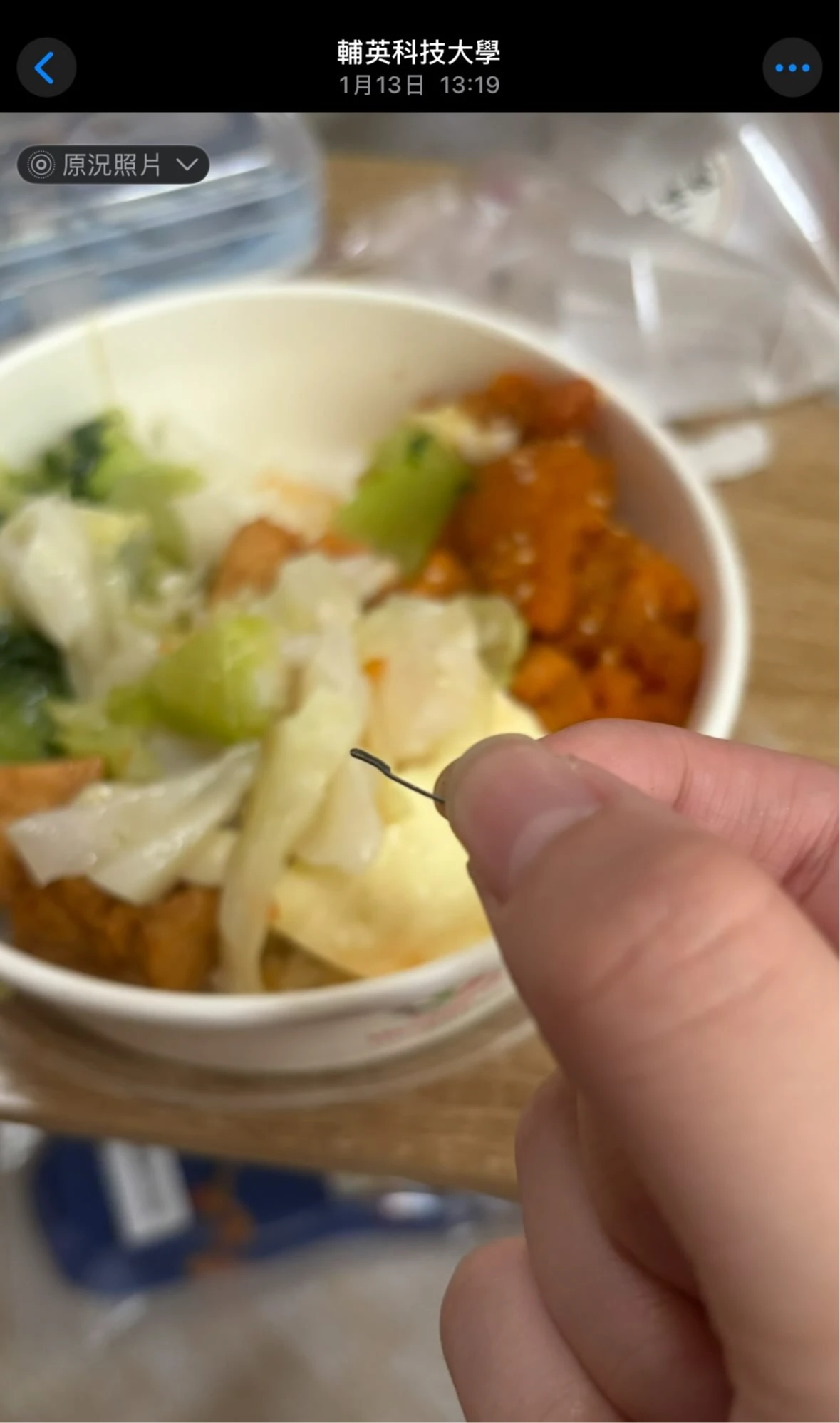 一名學生在Threads發文指出,在輔英科大學生餐廳購入雞排飯,不料吃到一半赫然發現「雞排飯裡有炸過的釘書針,不知道是不是心理作用,肚子也開始痛了!」