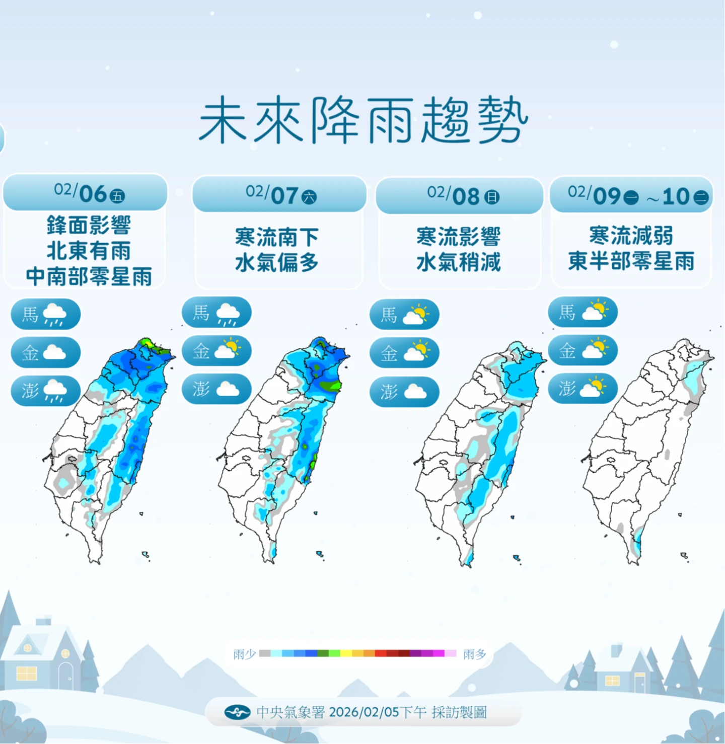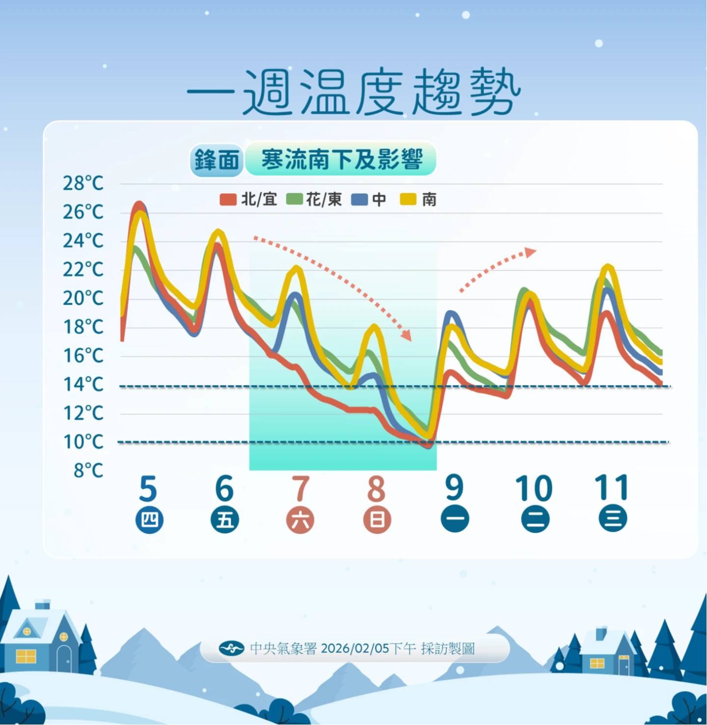 下周日(8日)至下周一(9日)清晨將是這波寒流威力最強的時刻,天氣轉為「乾冷」,水氣逐漸減少,各地多雲到晴,僅東半部有零星雨。氣溫將非常寒冷,預測台南以北及宜蘭低溫約9至14°C,南部及花東11至17°C,離島的金門僅8至10°C,馬祖更低至6至7°C。