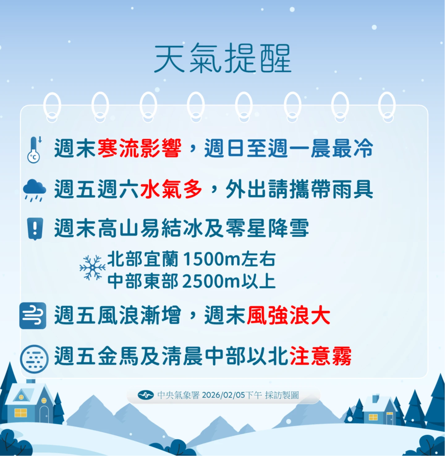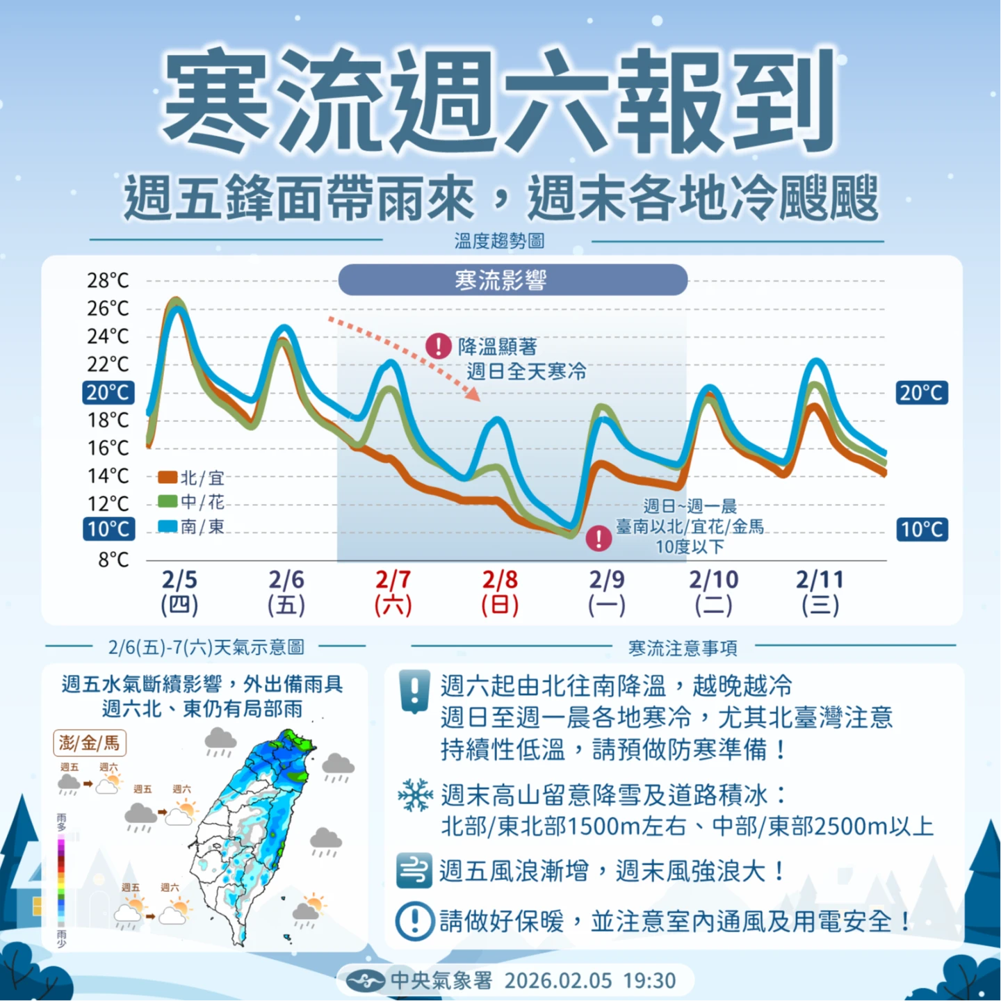 氣象署說,周末寒流籠罩全台,氣溫將如「溜滑梯」般由北往南下降,且愈晚愈冷。明天屬於「濕冷」,北部與宜蘭有廣泛降雨,花東及中南部山區也有局部雨勢。若低溫與水氣配合,北部及東北部1500公尺以上、中部及東部2500公尺以上高山,將有降雪機率,行經高山路段需防範路面結冰。