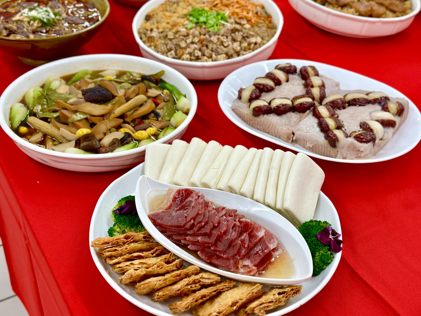 「南門市場逸湘齋 迎春納福套餐組」5~6人份,包含五更腸旺、佛跳牆、干貝櫻花蝦油飯、藥膳雞湯、蜜汁雙方、鮑魚燴海參、芋泥心太軟3,088元;「鯉魚 駿饗年菜組」4~6人份,含秘特製醋溜川耳、開胃涼拌海蜇頭、富貴財庫醬燒蹄膀、瑤柱櫻花蝦烏魚子米糕、樹子蒸爐魚、富貴蔘煲雞湯3,998元。