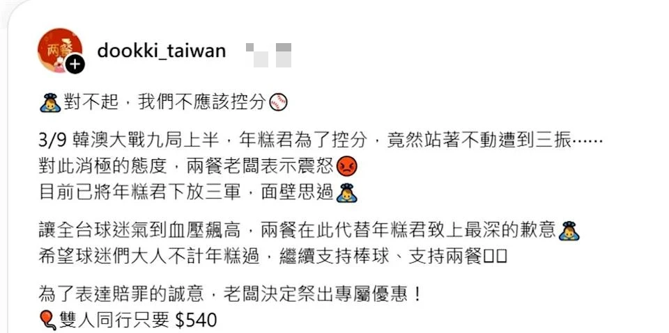 【記者盧麗蓮/綜合報導】2026年世界棒球經典賽(WBC)的C組預賽,攸關3隊誰能晉級的韓澳關鍵戰,韓國隊以7比2擊敗澳洲隊,以最佳的對戰失分率驚險晉級8強,不過韓國隊強棒文保景最後1打席「站著被三振」一幕,一度引發台灣球迷質疑「控分」、「搞台灣」,文保景IG甚至因此遭洗版,不過隨後也有人分析文保景只是按照晉級規則玩,也可能只是想讓韓國投手盡快上場,「別冷掉」。而國內連鎖韓式料理「兩餐」竟將此事作為行銷優惠文,引起網友強烈反彈,今天緊急道歉,承認設想不夠周全。