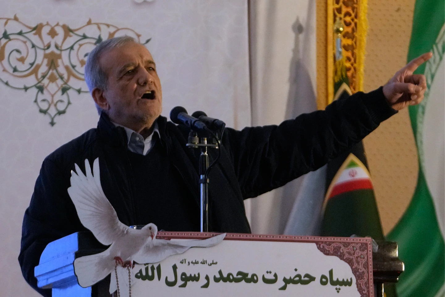 伊朗總統裴澤斯基安1月1日在德黑蘭伊瑪目霍梅尼大清真寺發表演說。美聯社