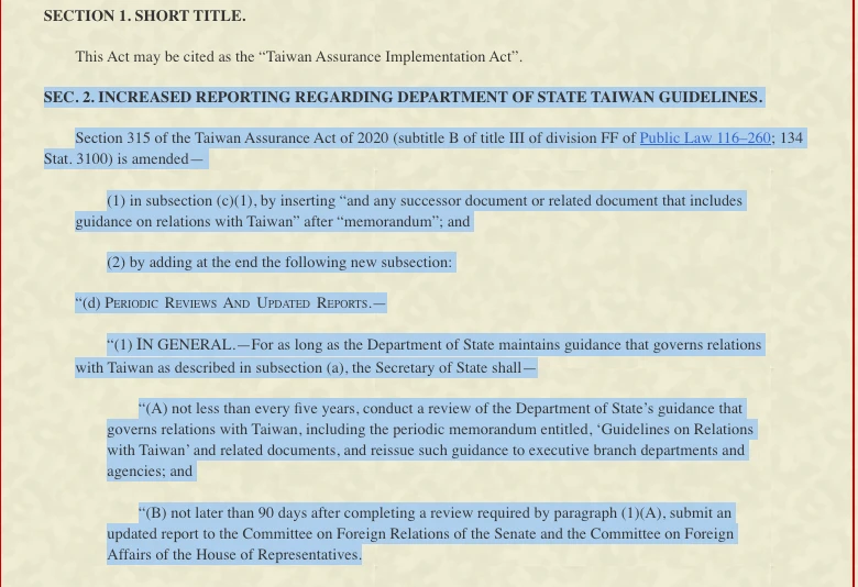 彭博12月2日報導,這項《台灣保證實施法案》(Taiwan Assurance Implementation Act)要求國務院定期審查,以闡明這些指導方針如何深化美台關係。