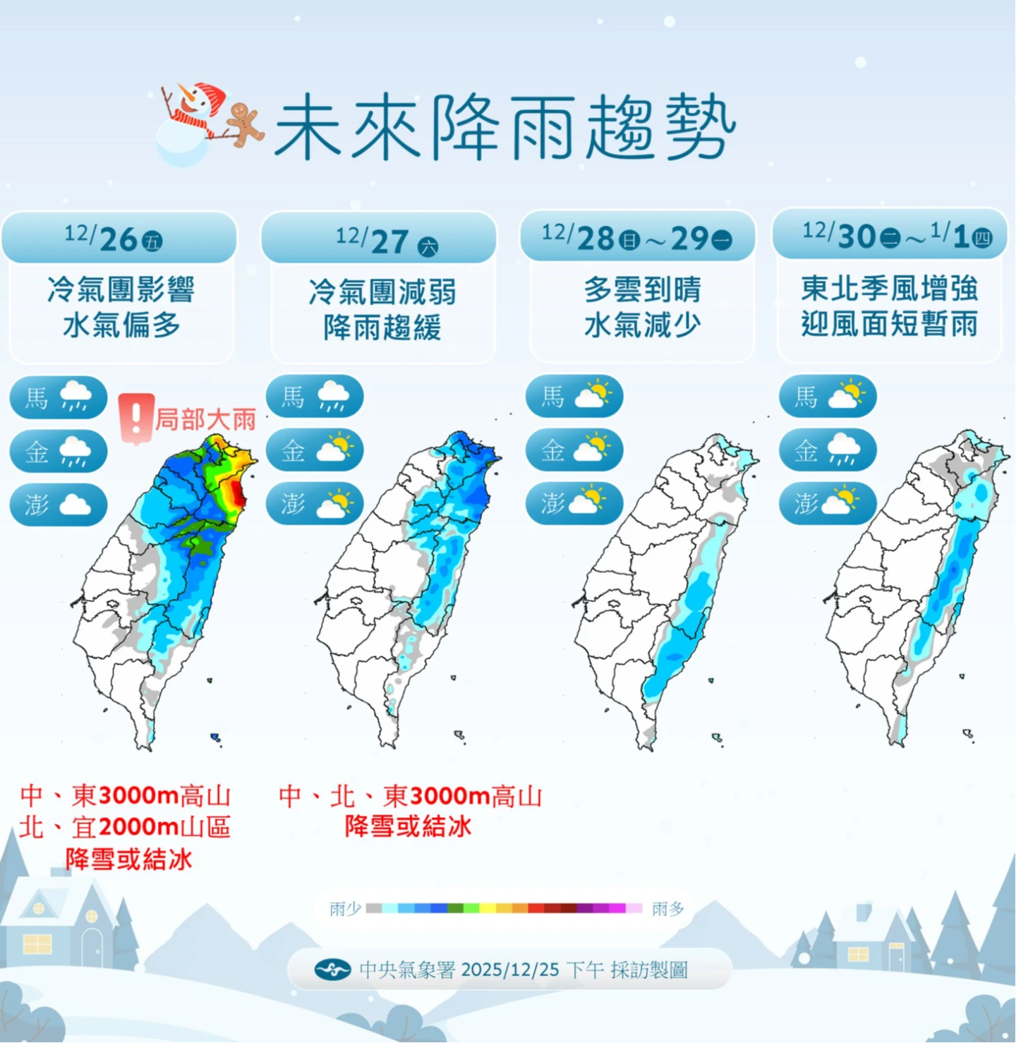 降雨方面,水氣偏多,基隆北海岸、宜蘭及大台北山區有局部大雨。此外,若溫度與水氣配合,今晚至明晨北部及宜蘭2000公尺以上、中部及花蓮3000公尺以上高山,仍有零星降雪或結冰機率。