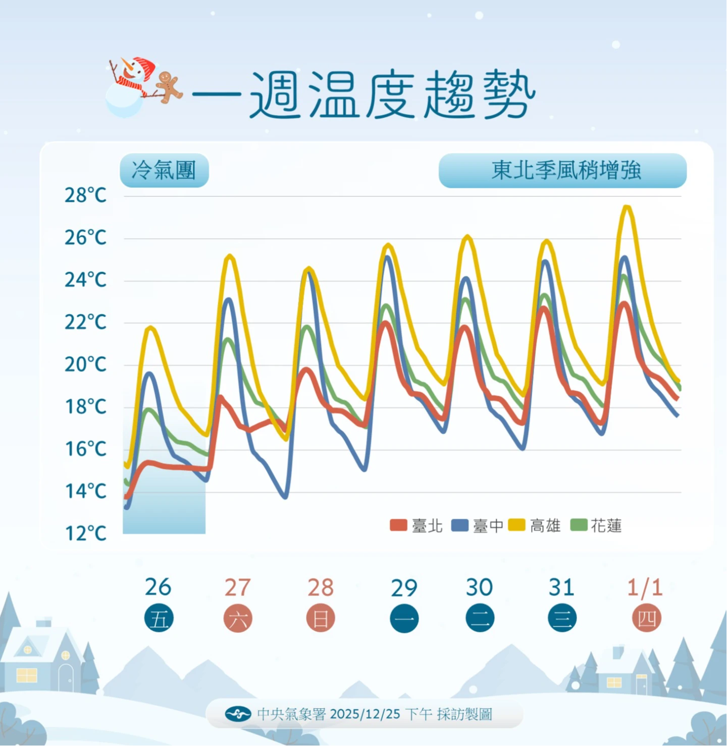 下周二(30日)至元旦(1/1),另一波東北季風稍微增強。預測跨年夜至元旦清晨,全台各地低溫約15至17°C;高溫部分,北部及東半部約22至24°C,中南部約26至27°C。