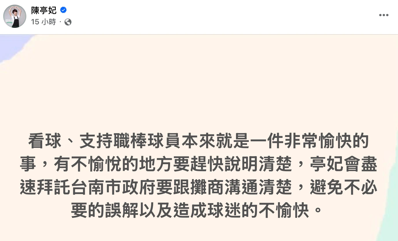 面對民意沸騰,民進黨台南市長候選人、立委陳亭妃第一時間發聲,強調看球本是美事,呼籲市府應與攤商充分溝通,避免不必要的誤解傷了球迷的心。