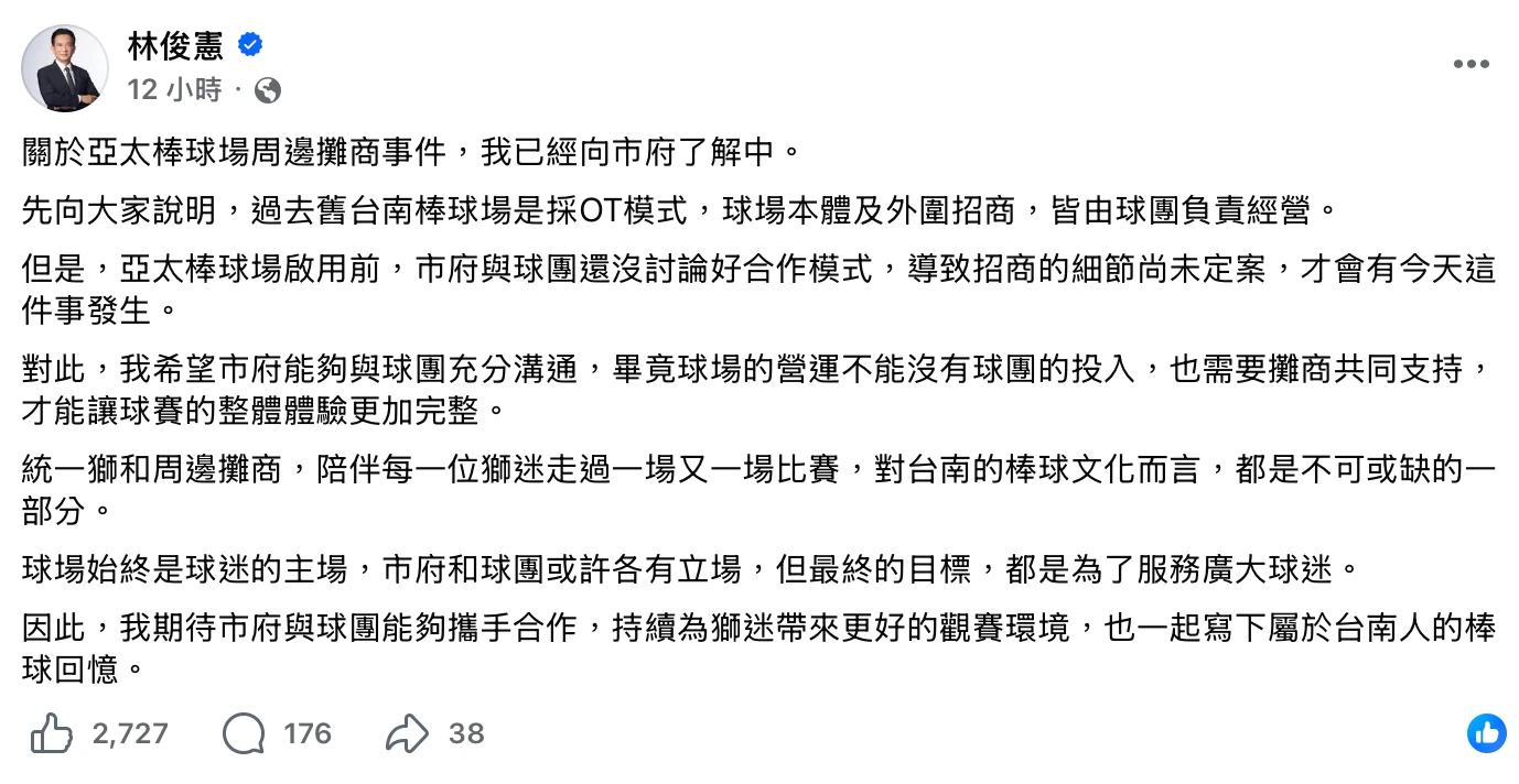 立委林俊憲則分析,舊球場過去採OT模式由球團全權招商,但亞太球場目前合作模式尚未定案,才導致招標細節與現實脫鉤。他期盼市府能與球團攜手,不要讓行政作業破壞觀賽體驗,畢竟這些攤商早已是台南獅迷記憶中不可或缺的一環。