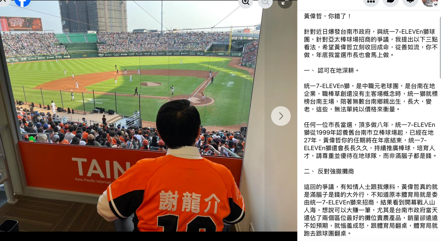 他強調,統一獅深耕台南27年,市府應尊重球團專業並採「完整認養」模式,而非將新球場當成搖錢樹殺雞取卵。謝龍介更放話若他當選市長將立即收回成命,優先保障在地攤商與球迷權益,並呼籲賴清德總統與中職會長蔡其昌介入調解。