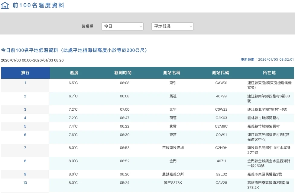 【記者陳力維/綜合報導】今日(1/3)清晨全台爆冷,氣象署觀測數據顯示,本島平地最低溫出現在雲林縣古坑鄉,僅有7.2度。令人訝異的是,南部地區氣溫大幅降溫,高雄跌至8.0度、台南8.4度,低溫程度罕見超越北部地區。前氣象局長鄭明典對此表示,這波低溫主要是受到輻射冷卻影響,高雄與台南同時出現在低溫榜單上,應該是史上頭一遭。