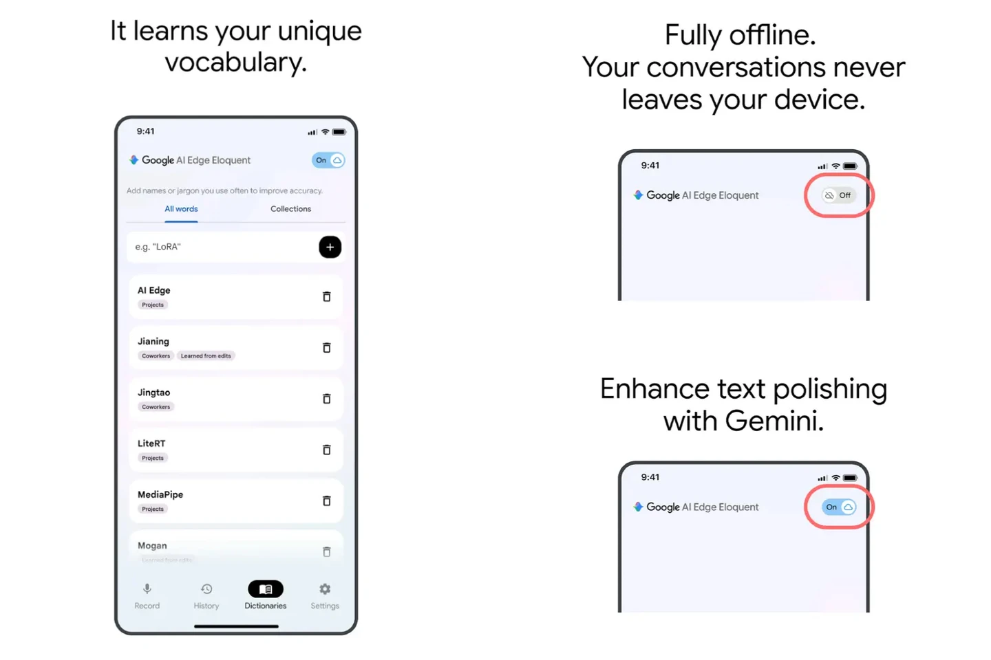 這款是裝置端人工智慧(AI),讓音訊處理和轉錄直接在使用者裝置上完成。關鍵特性在於使用Google開發的輕量級AI模型Gemma,可在語音結束後立即優化文字輸出,例如去除語氣詞、糾正語法錯誤並提高清晰度。