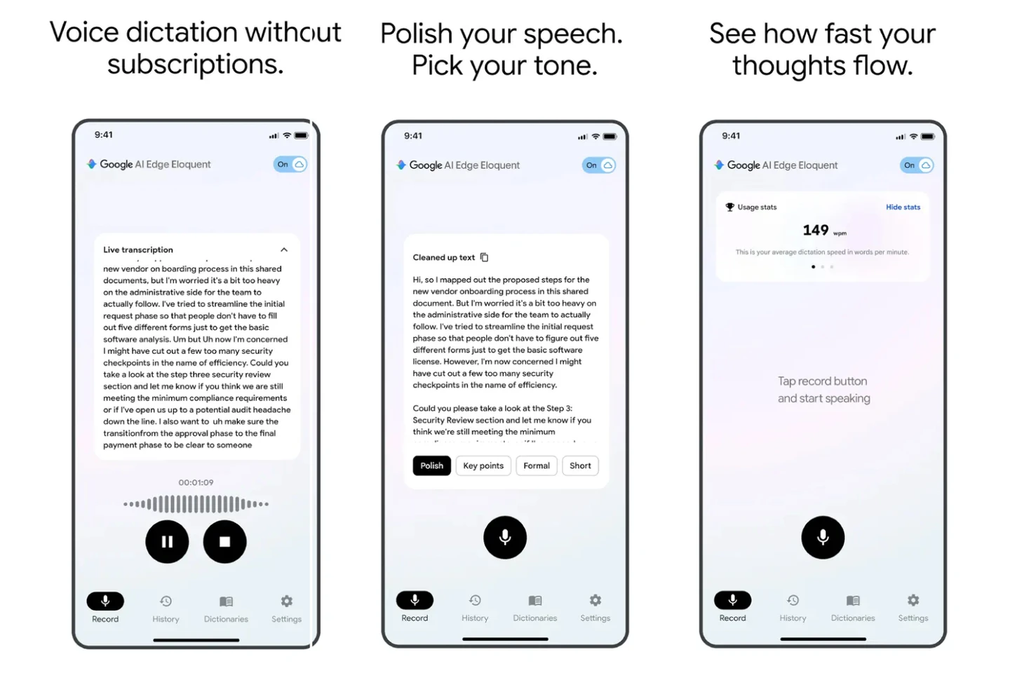 (AI 摘要說明)這款Google AI Edge Eloquent完全免費,無需訂閱費用,對於學生、專業人士和經常依賴語音輸入進行筆記和文件記錄的一般用戶來說,是理想工具。