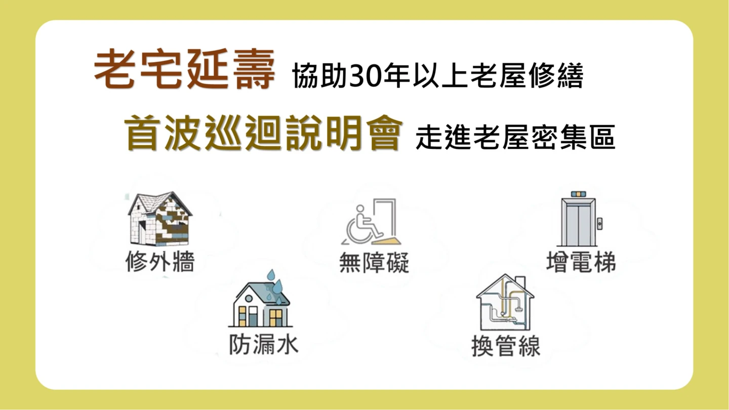 「老宅延壽機能復新計畫」補助範圍包括外牆修繕、屋頂防漏、電力與管線更新、增設電梯與無障礙設施等公共空間改善;住宅內部則可補助增設扶手、改善高低差、鋪設防滑材質與防墜設備等項目。