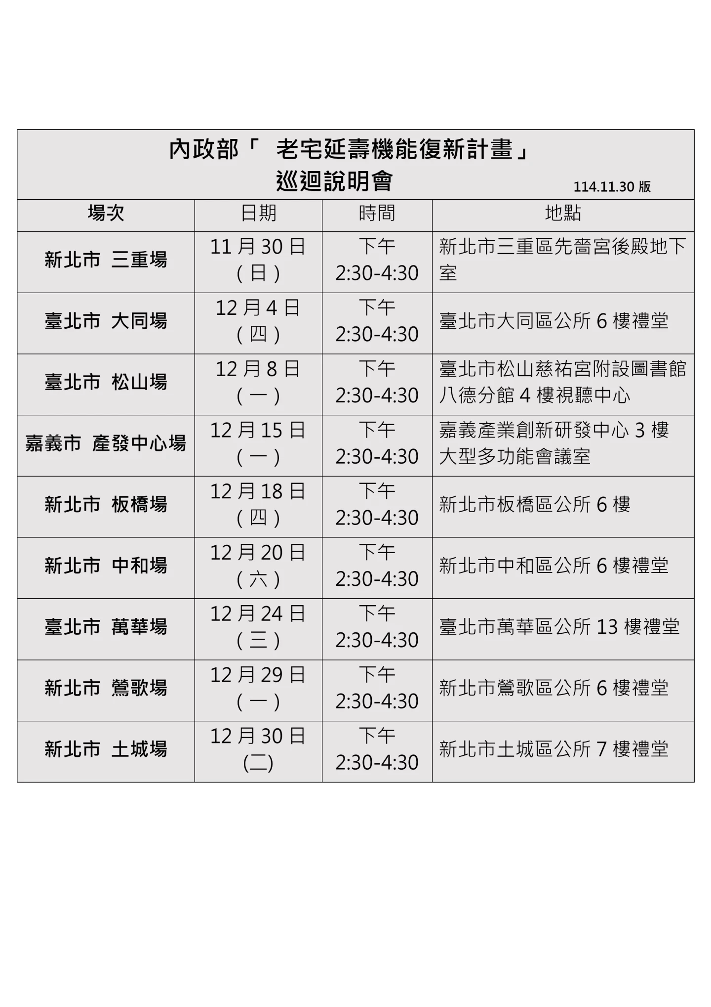 劉說,內政部「老宅延壽機能復新計畫」巡迴說明會,首波會優先到台北市、新北市人口稠密及老屋較多的區域舉辦;另國土管理署已設置諮詢專線:02-7701-9919並提供專人服務,相關資訊也公布在都市更新入口網」,鼓勵民眾與社區踴躍申請,以提升居住安全,逐步實現「在宅健康老化、在地安老」目標。