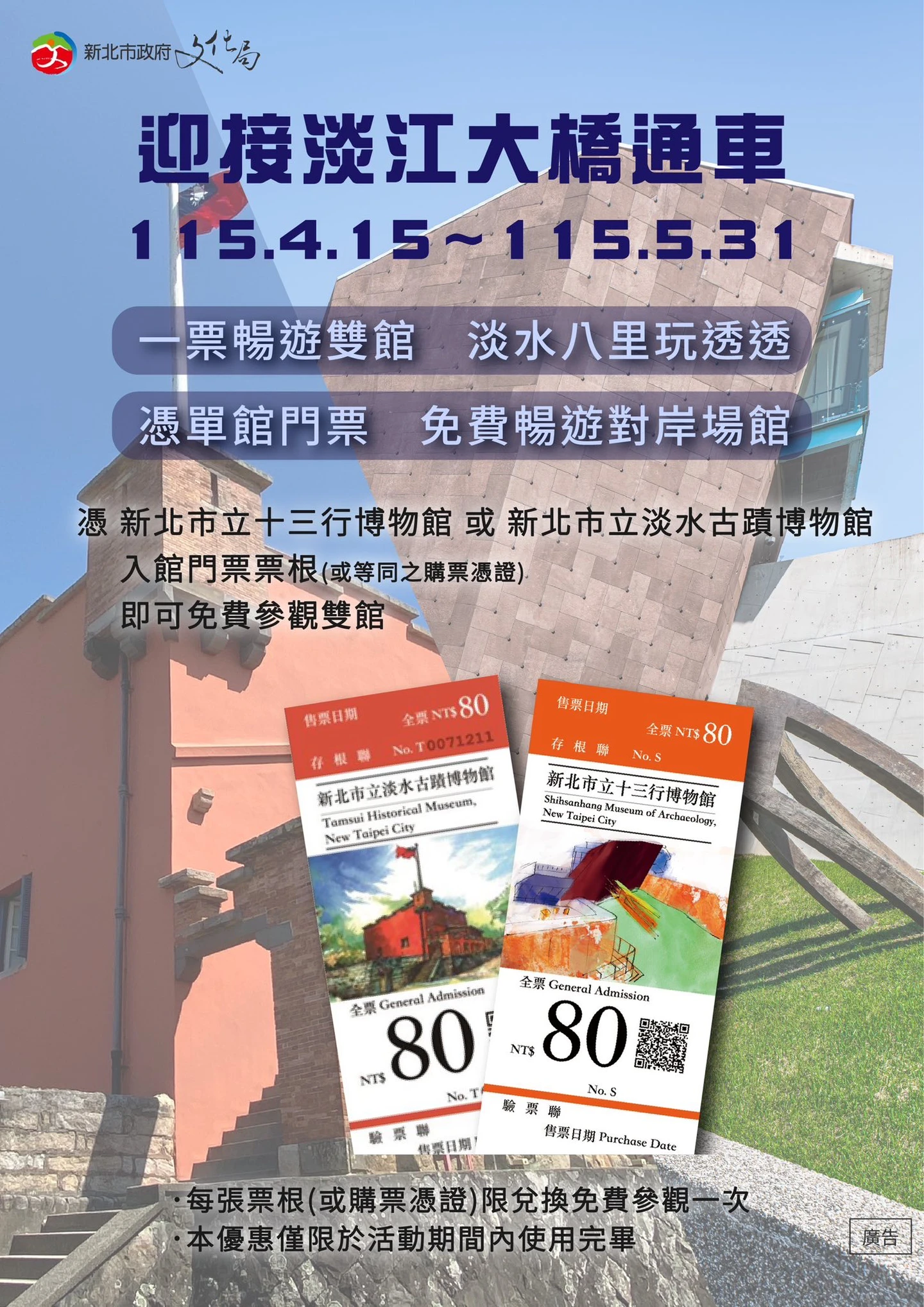 隨著淡江大橋通車在即,新北市立十三行博物館與淡水古蹟博物館特別為遊客奉上「一票遊雙館」的浪漫大禮。即日起至今年5月31日止,民眾只要持活動期間的任一館票根,就能享有對岸友館免費進場的優惠。