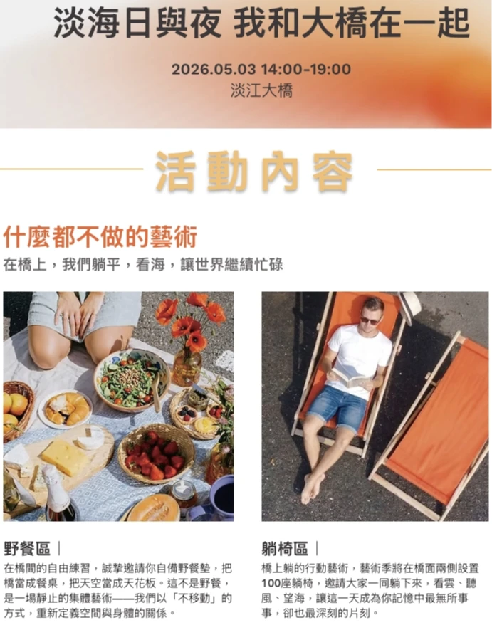 5月3日|「我和大橋在一起」野餐活動: 首度推出「躺平看海」體驗,於橋面設置野餐區與躺椅,搭配金枝演社環境劇場演出。