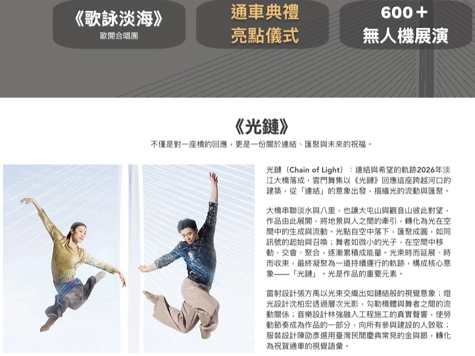無人機燈光秀:600架無人機將在河口高空與橋體光雕同步演出,為通車慶典畫下完美句點。