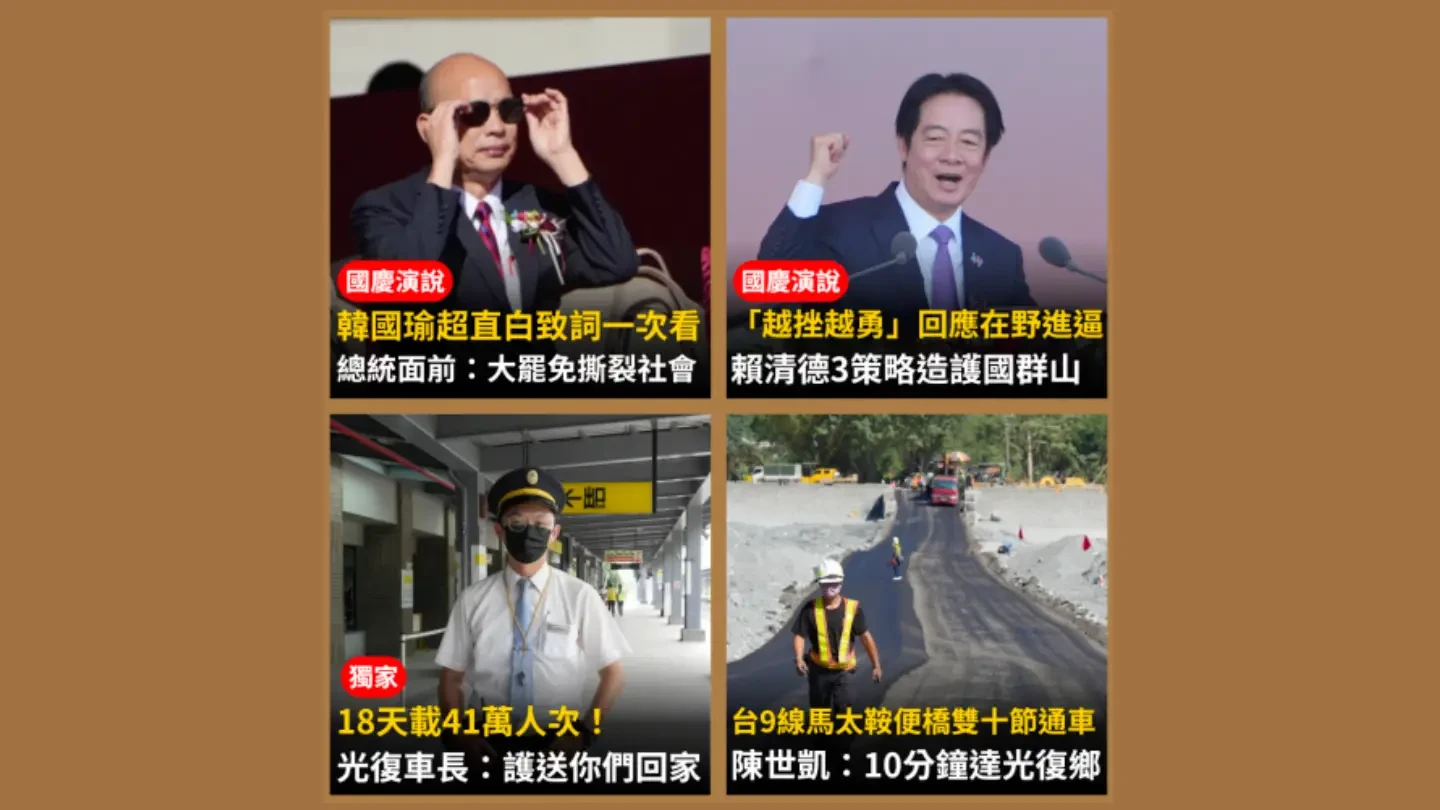 今日精選|韓國瑜超直白國慶致詞面斥賴清德/獨家|台鐵18天載41萬人次鏟子超人