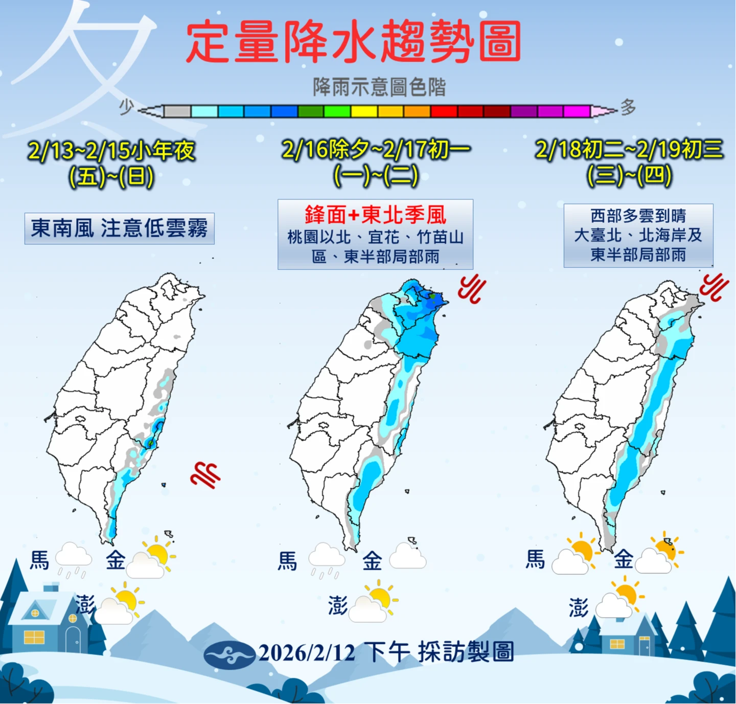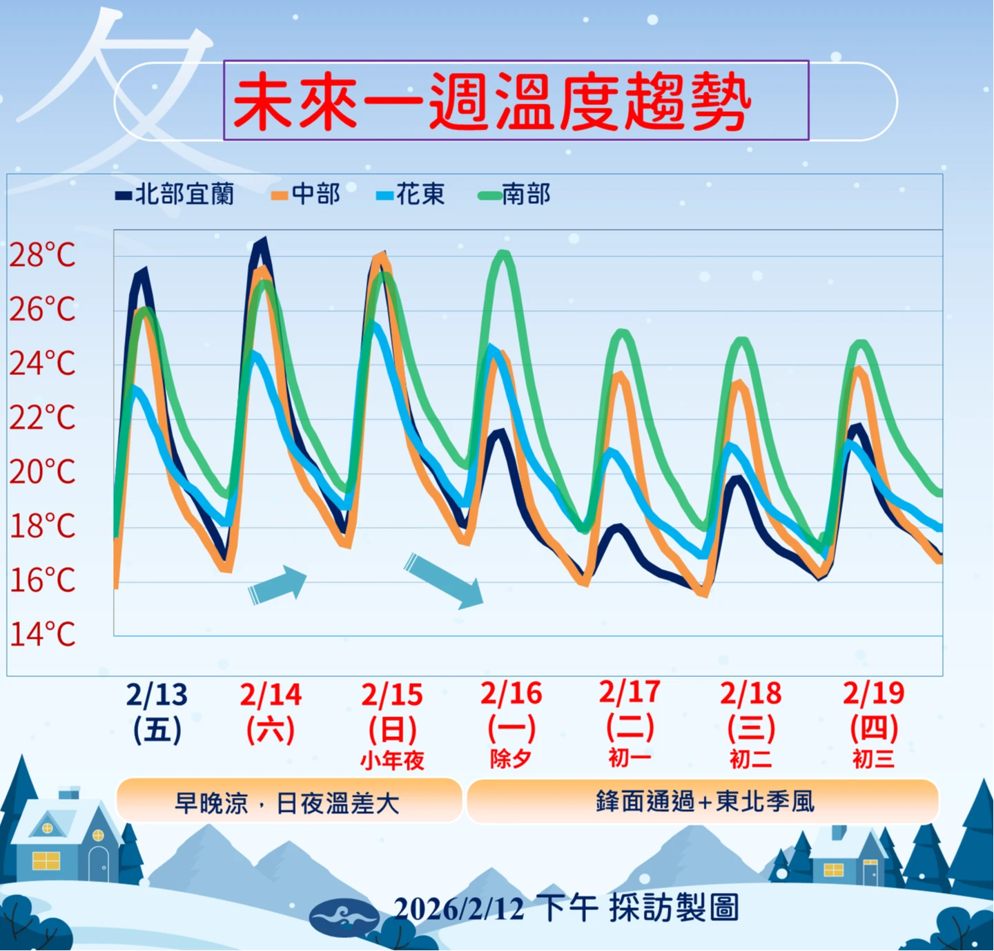 除夕(16日)起變天,隨鋒面通過及東北季風增強,北部與宜蘭氣溫明顯下滑,降雨範圍擴大至桃園以北與宜花地區。初一至初三(17至19日)受東北季風持續影響,北部低溫下探13°C,高溫僅18至22°C;中南部與台東影響較小,高溫仍有24至30°C,維持多雲到晴。