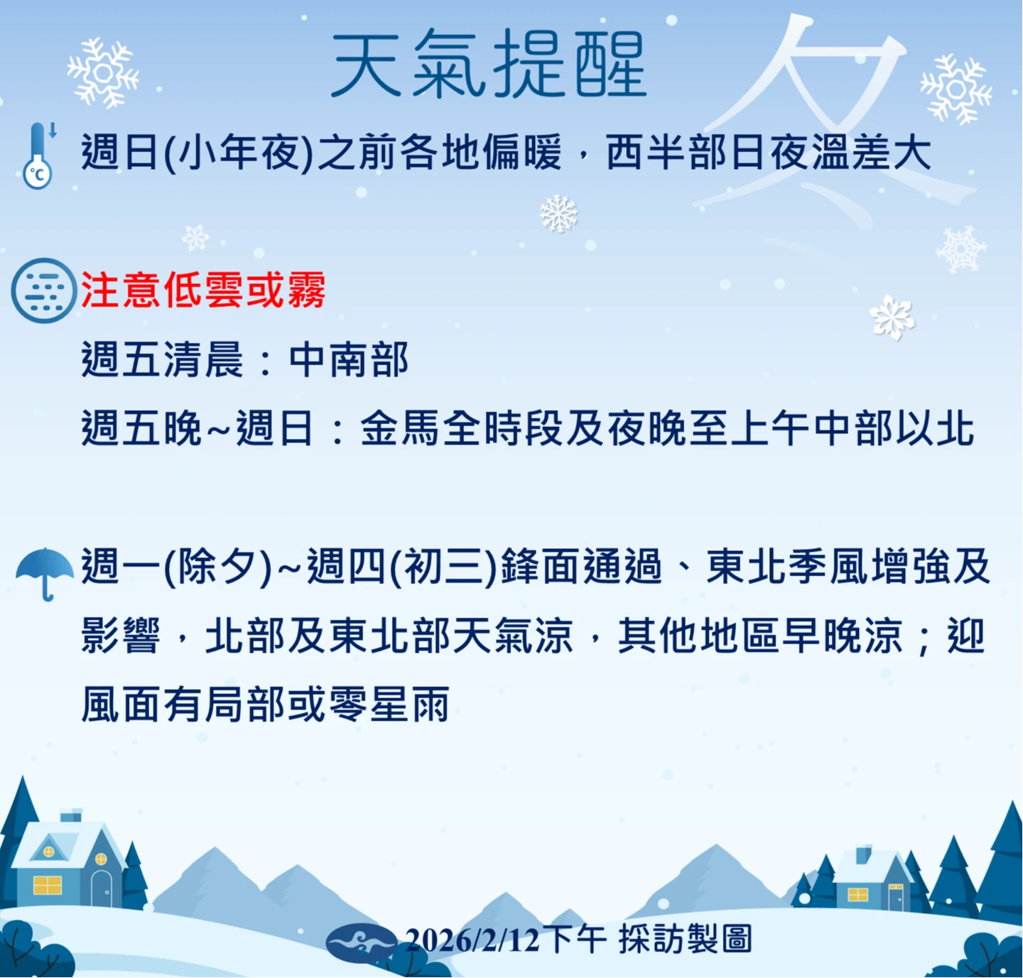中央大學大氣系兼任副教授吳德榮在「三立準氣象·老大洩天機」專欄撰文指出,最新(12日20時)歐洲模式(ECMWF)模擬顯示,今(13日)起至「小年夜」(15日)各地晴朗穩定、回暖如春,各地區高溫逼近30°C,適合年節前掃除,但因輻射冷卻,日夜溫差很大;西半部清晨及金、馬易起霧。