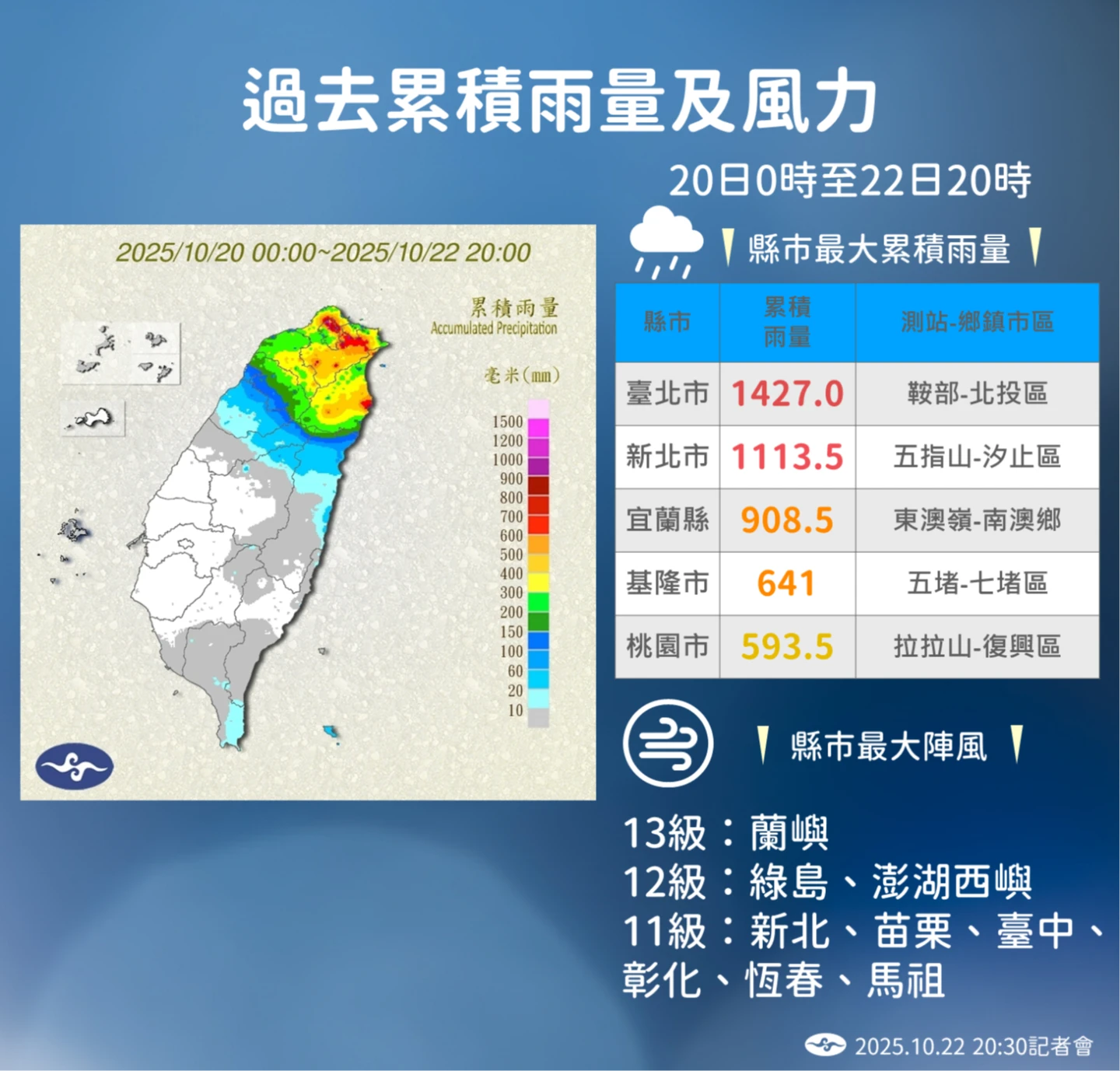 對於連日來的風雨情形,葉致均說,從10/20到今晚8時,新竹以北跟宜蘭降雨明顯,特別是台北陽明山、新北山區都有強降雨,宜蘭南澳也有顯著降雨,目前台北陽明山已經有1427毫米累積雨量,新北五指山、宜蘭也都有約1000毫米累積降雨。