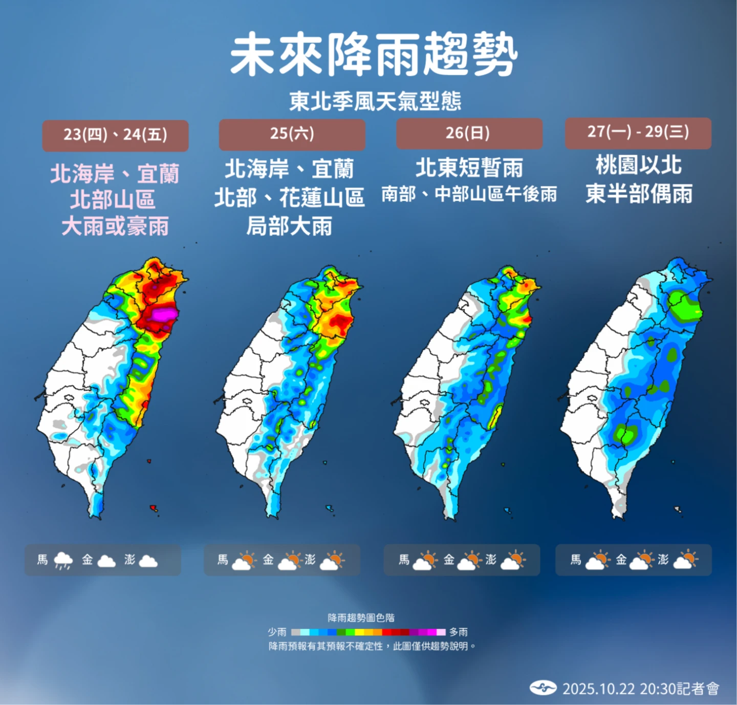 針對降雨趨勢,葉致均指出,明天及週五(10/24、10/25)還是受東北季風影響,但週五東北季風稍微減弱,不過,週六、週日(10/26、10/27)又有另一波東北季風增強,位處迎風面的北部、東部會降雨。