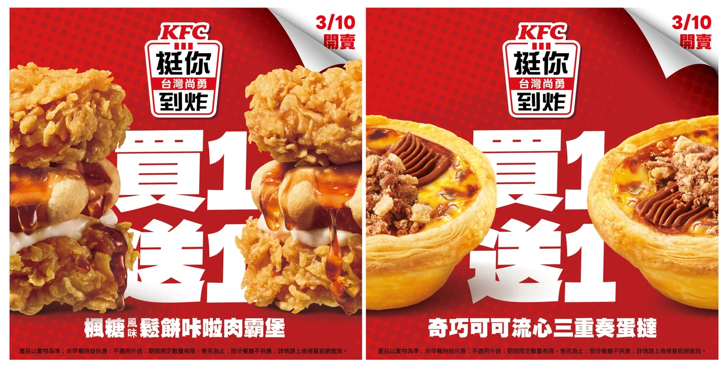 肯德基推出品牌史上首見的「新品買1送1」,3月10日起至售完為止,楓糖風味鬆餅咔啦肉霸堡2件原價318元、優惠159元,等於打5折;同時段,奇巧可可流心三重奏蛋撻2件原價110元、優惠55元,也是半價。另外,3月10日至3月23日,限時兩周,咔啦脆雞6塊+原味蛋撻極酥6個原價720元、優惠333元,等於下殺46折,優惠代碼「50488」。