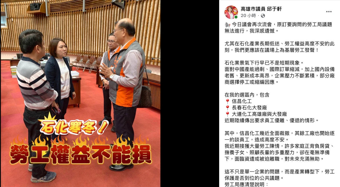 針對石化業大規模縮編,邱于軒遺憾表示,昨天議會流會導致無法針對勞工議題進行質詢。這不只是單一企業經營問題,而是產業轉型過程中的勞權公共危機,強烈要求高市府主動介入調查,應清楚資遣程序是否合法、是否依法通報、轉職協助、職訓銜接與生活支持是否到位。