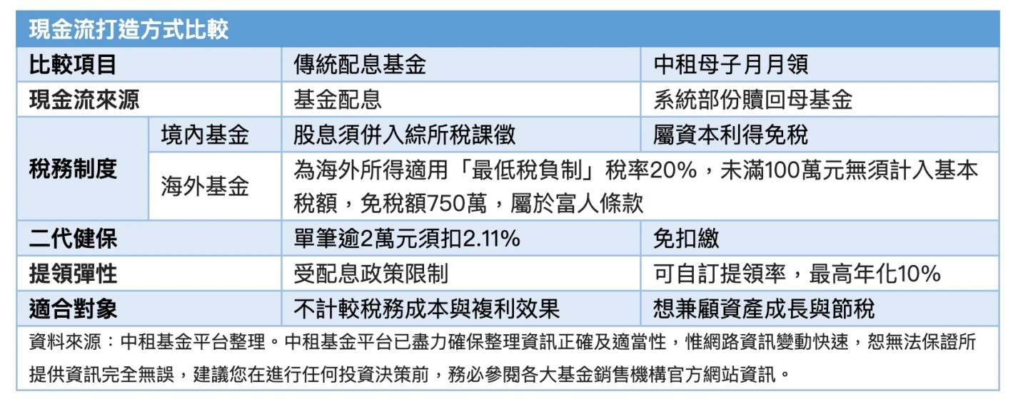 傳統配息基金雖然曾是國人創造現金流的最愛,但在當前稅務環境下,配息須全額計入個人綜合所得稅,單筆股利若超過新台幣2萬元,還須負擔2.11%的二代健保補充保費,導致實領金額大打折扣。中租基金平台總經理蘇皓毅觀察,近年投資人對稅務成本更加敏感,開始轉向兼具提領與節稅優勢的「中租母子月月領」自製現金流機制。
