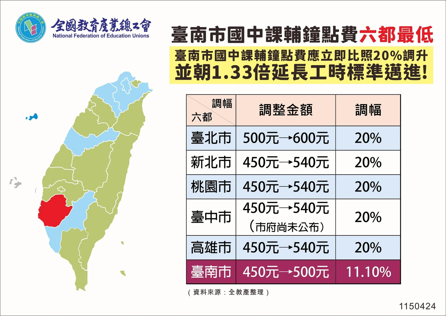 【記者王良博/台北報導】近期許多縣市調高國中課後輔導鐘點費,全國教育產業總工會(全教產)今(24)日表示,台南市僅調升至500元,調幅約11.1%,為六都最低,不僅落後多數城市的20%調幅,更與延長工時合理對價精神存在明顯落差,要求台南市府立即檢討調幅,至少比照六都主流的20%標準,並研議朝1.33倍延長工時標準調整。