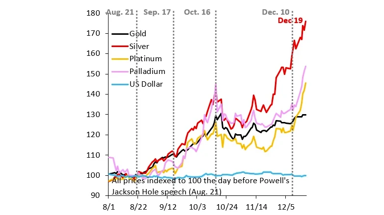 自今年8月聯準會主辦的傑克森霍爾年會以來,短短4個月白銀價格飆升76%,鈀金大漲65%,鉑金漲幅也達到45%,而引發貴金屬瘋狂上漲的黃金漲勢相對落後,漲幅僅30%。